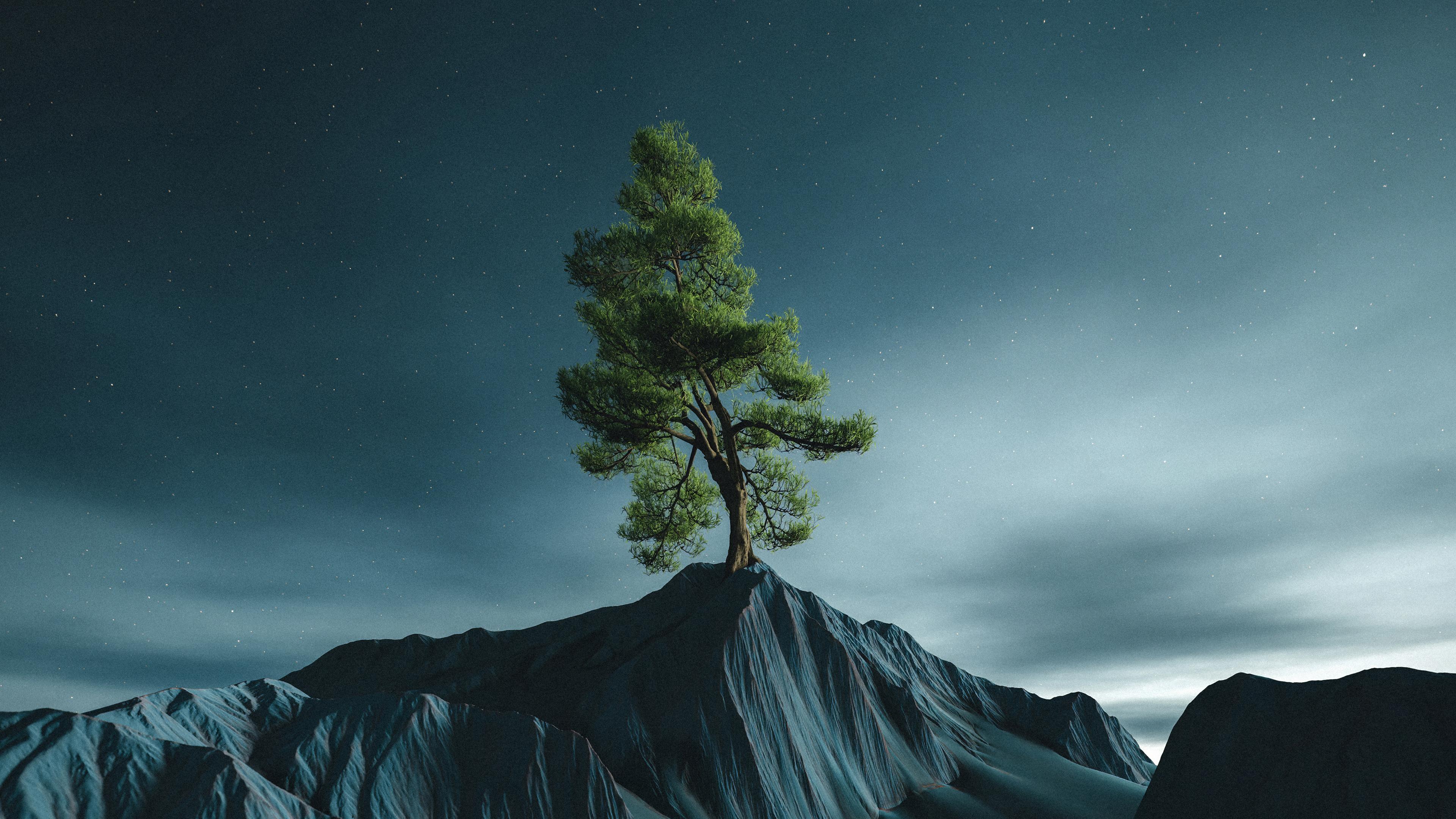 Lone Tree Under Starry Sky 4K Desktop Wallpaper