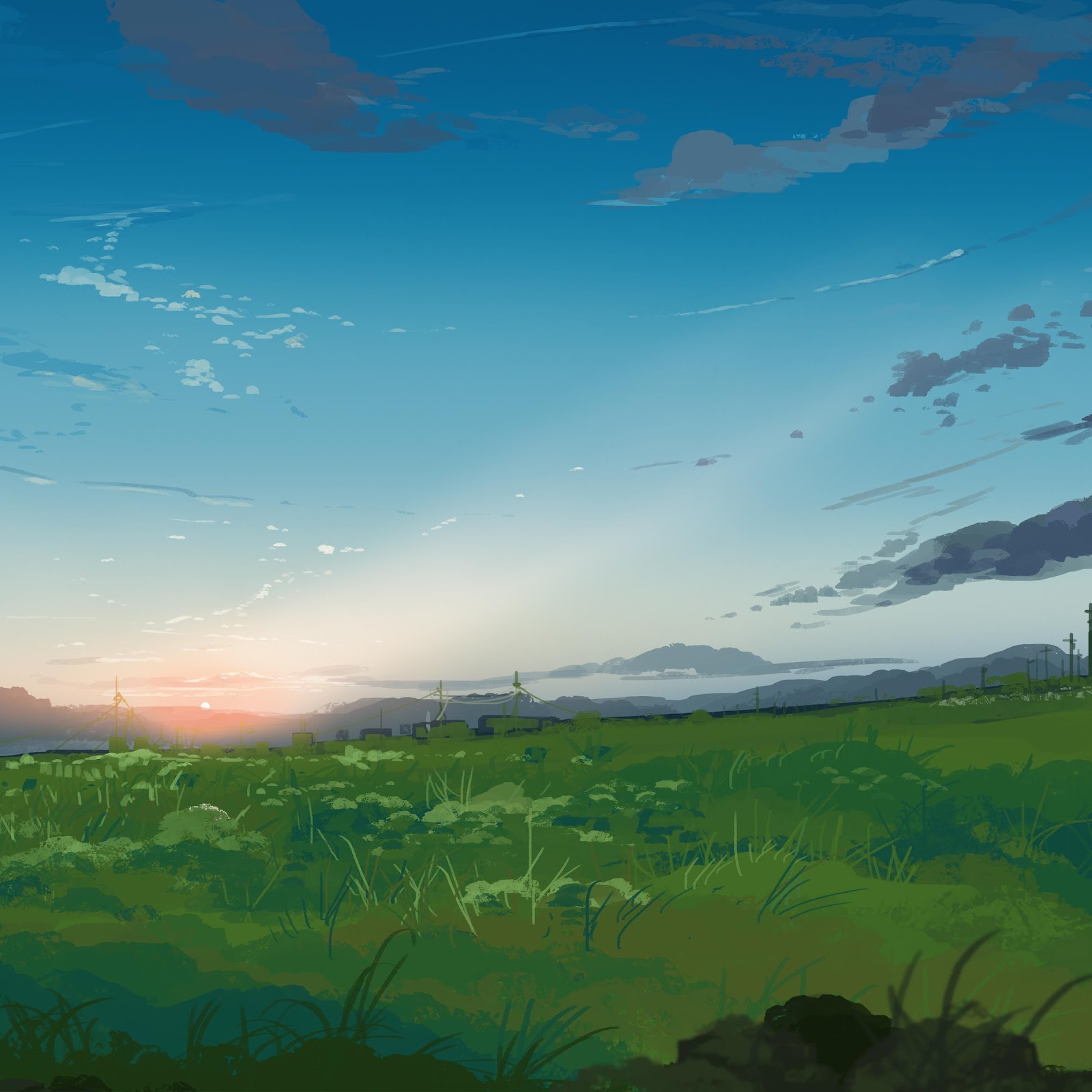 A wide landscape painting of a green meadow spreads out toward distant hills and telephone poles at sunset, rendered in a detailed anime aesthetic.