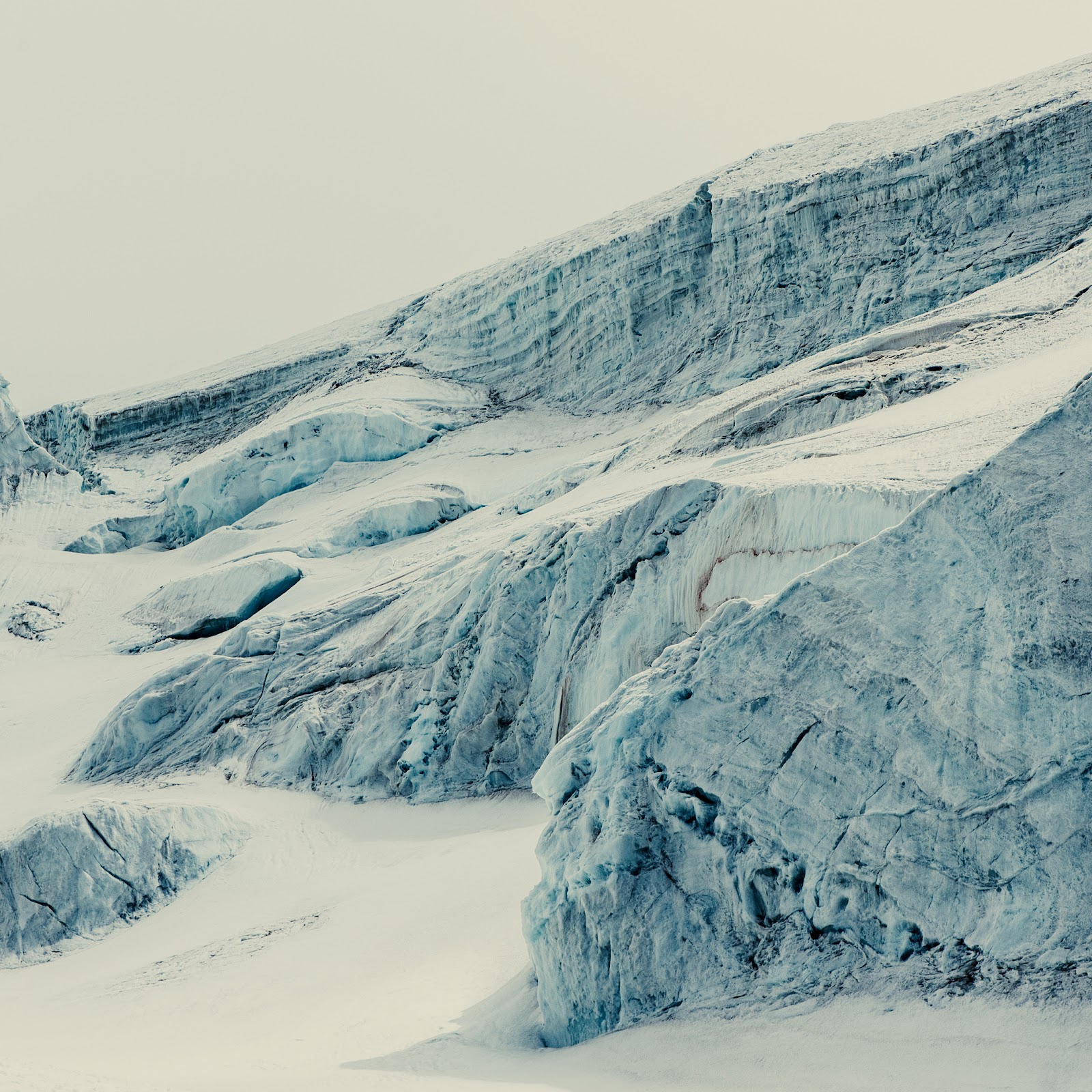 The massive glacier ice wall stands steeply above a field of snow, showing deep blue textures in a cold environment.