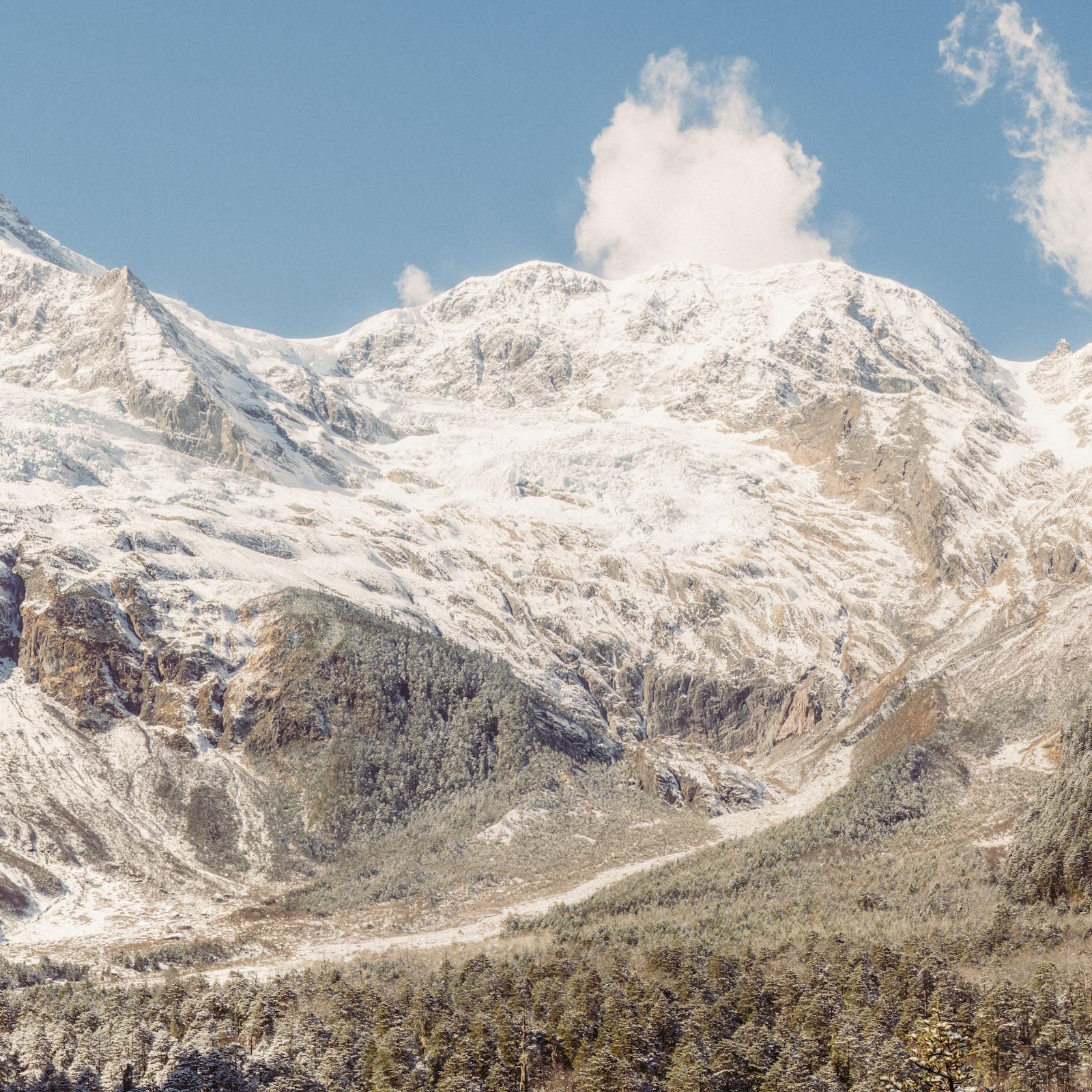 Towering snow-covered mountains rise dramatically over a forested valley under a clear, bright blue winter sky.