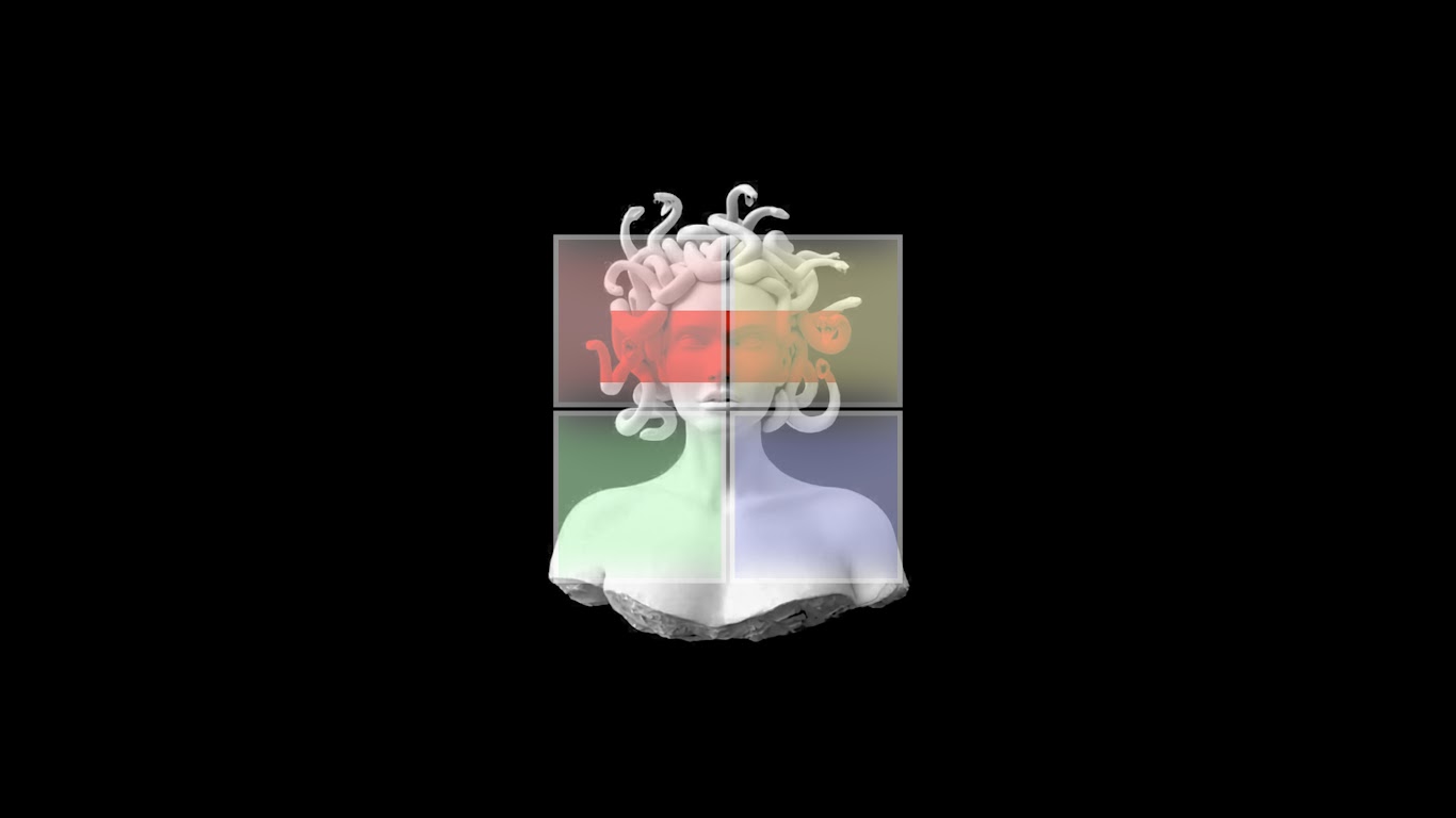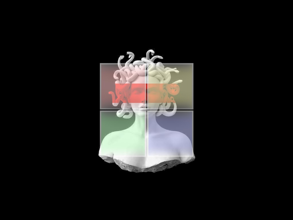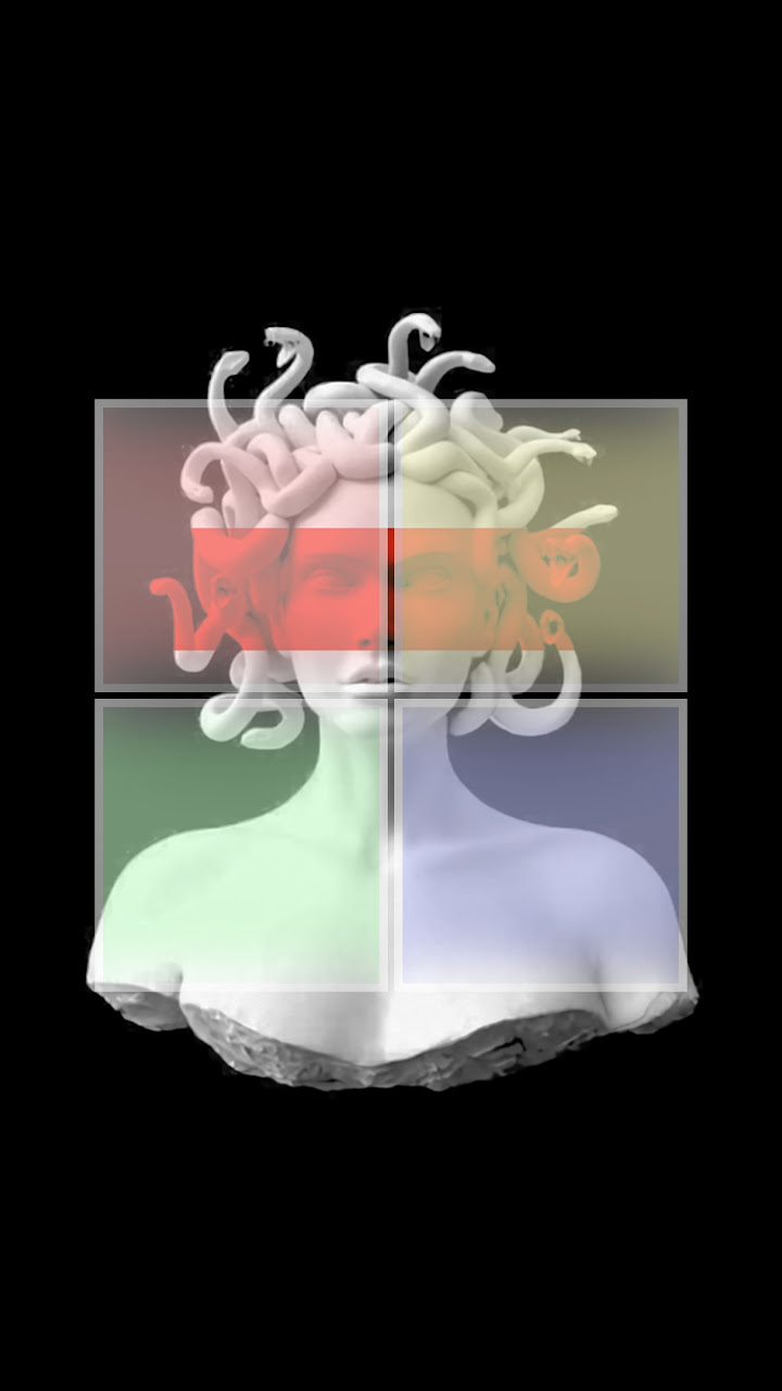 A statue of Medusa with snake hair is split into four red, yellow, green, and blue colored sections against a solid black background.