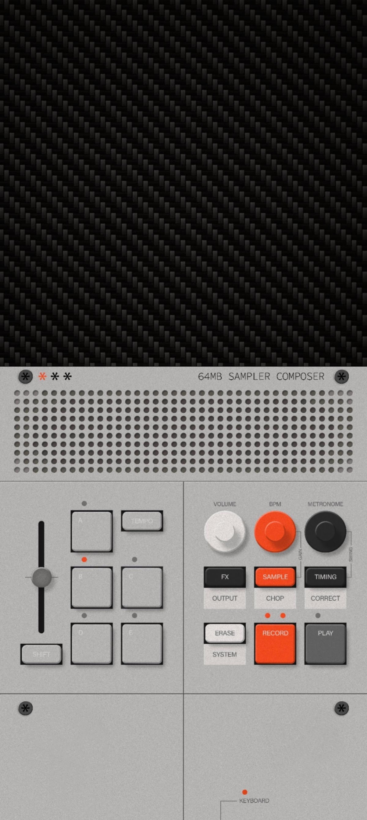 A music sampler interface with a gray control panel and bright orange buttons is set beneath a dark carbon fiber texture.