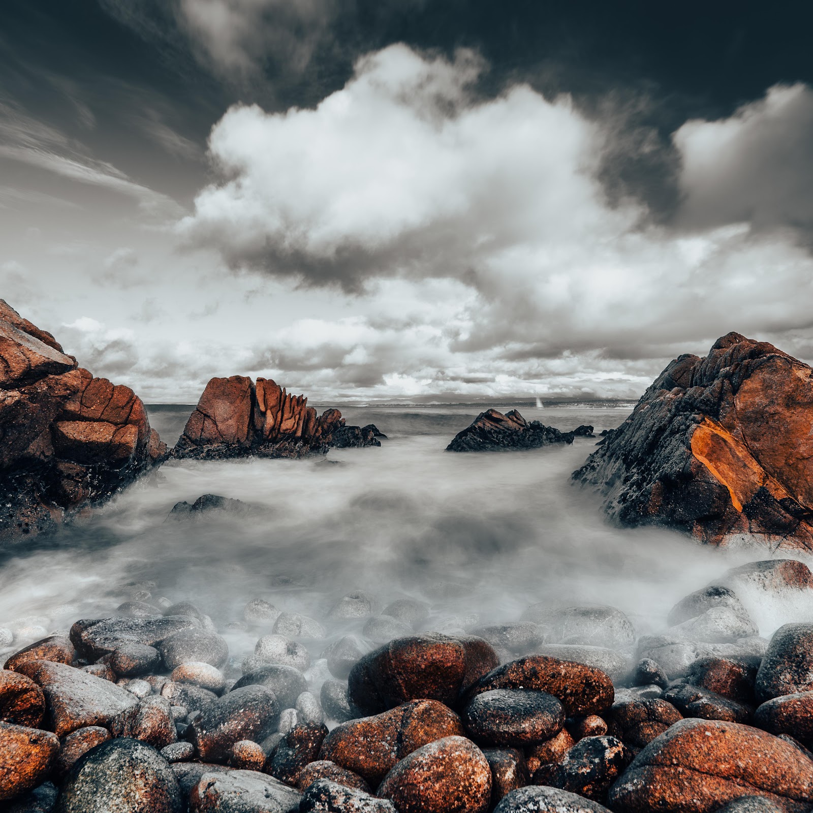 Large reddish-brown coastal rocks are surrounded by misty, flowing waves under a dark, dramatic sky, creating a beautiful moody atmosphere.