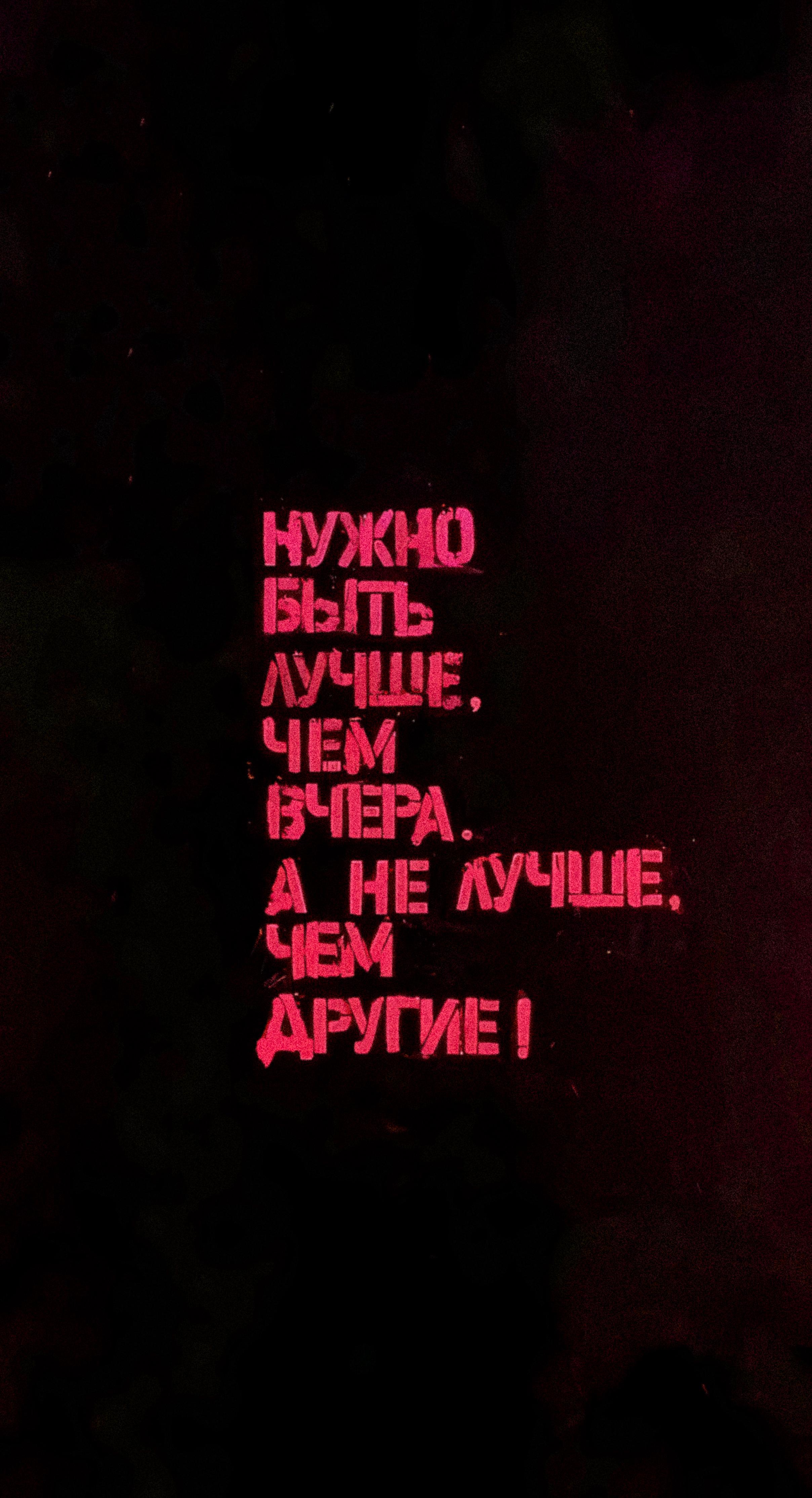 Motivational Russian Text Art 4K iPhone Wallpaper The Russian motivational quote, "Be better than yesterday," is displayed vertically using distressed bright pink neon letters on a dark, stark background. cj894 815.89 KB 2416x4456 Download original File Size: Dimensions: Resolution: 4K Format: Mobile ID: Black Background Motivation Neon Quote Pink Aesthetic Red Russian Text Typography