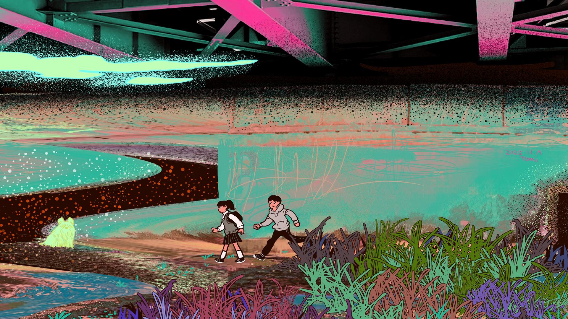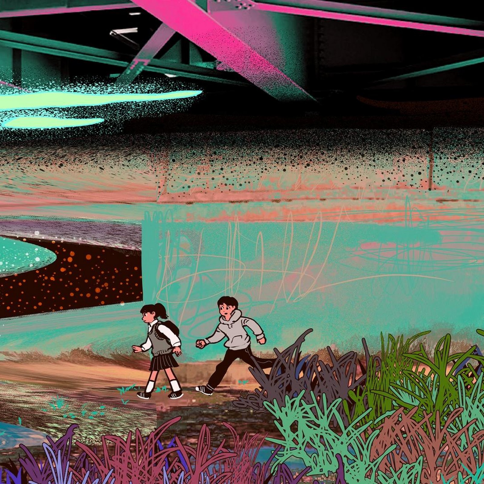 A young boy and girl walk under a massive concrete bridge structure displaying vibrant pink and cyan colors in a bold digital illustration.