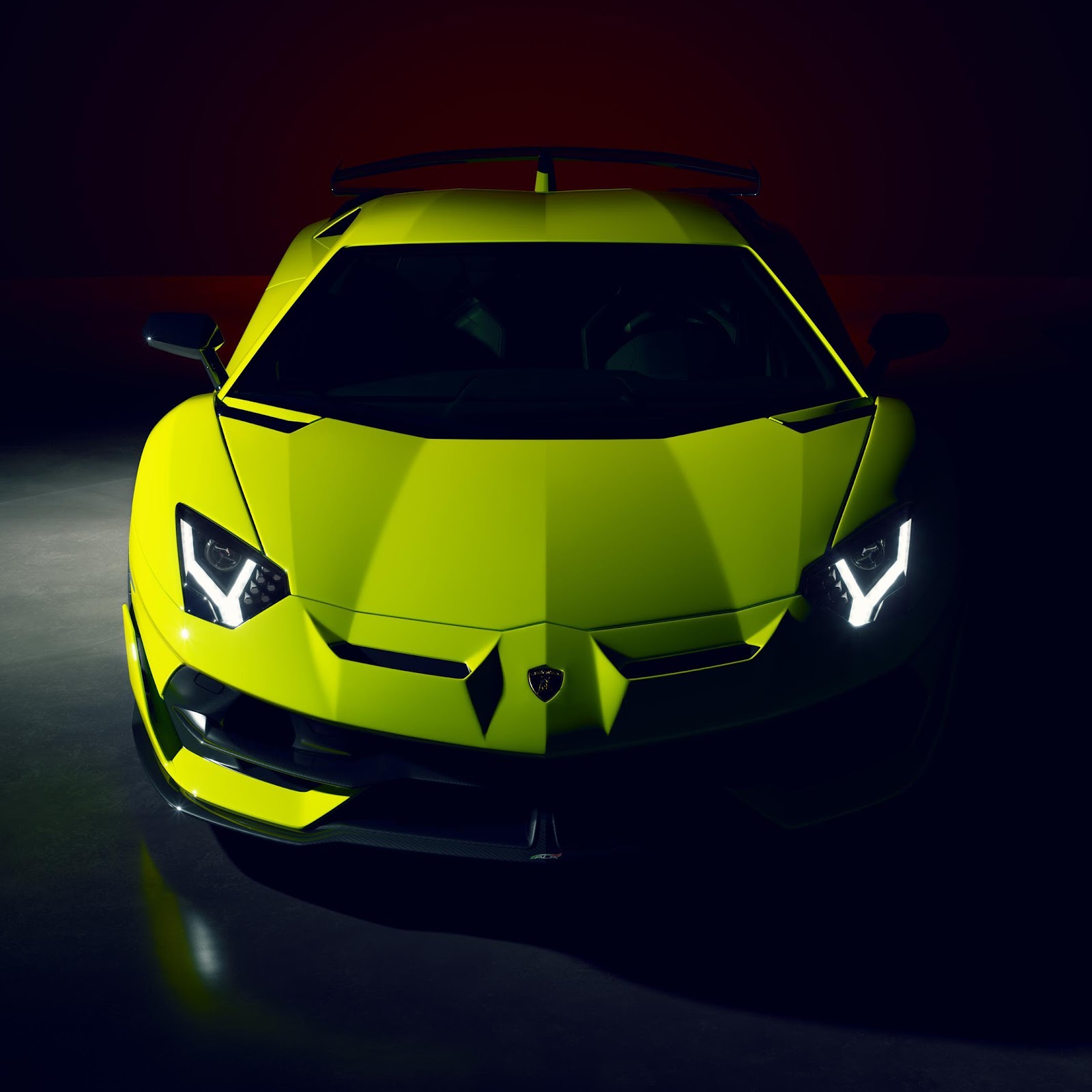 The neon yellow Lamborghini Aventador is centered in a dark studio setting with its bright, angular headlights shining forward.