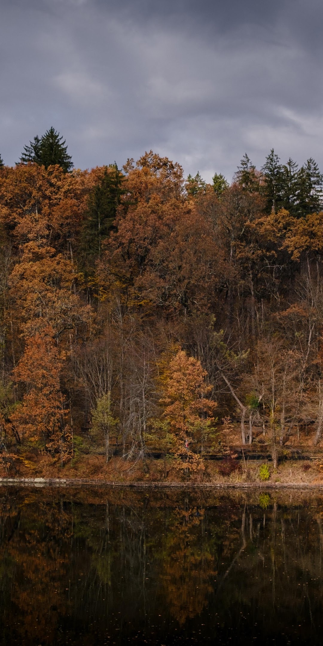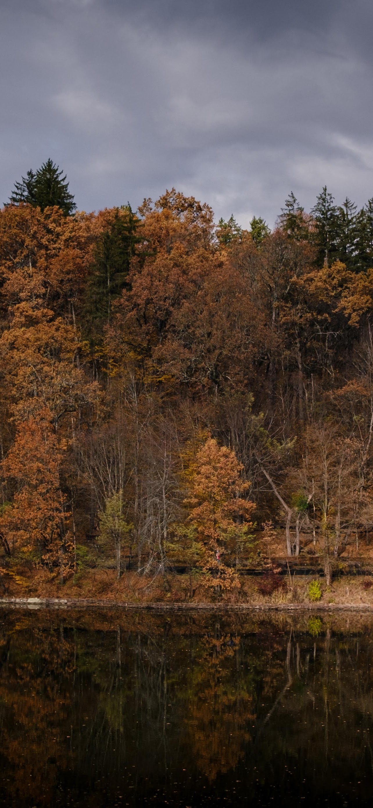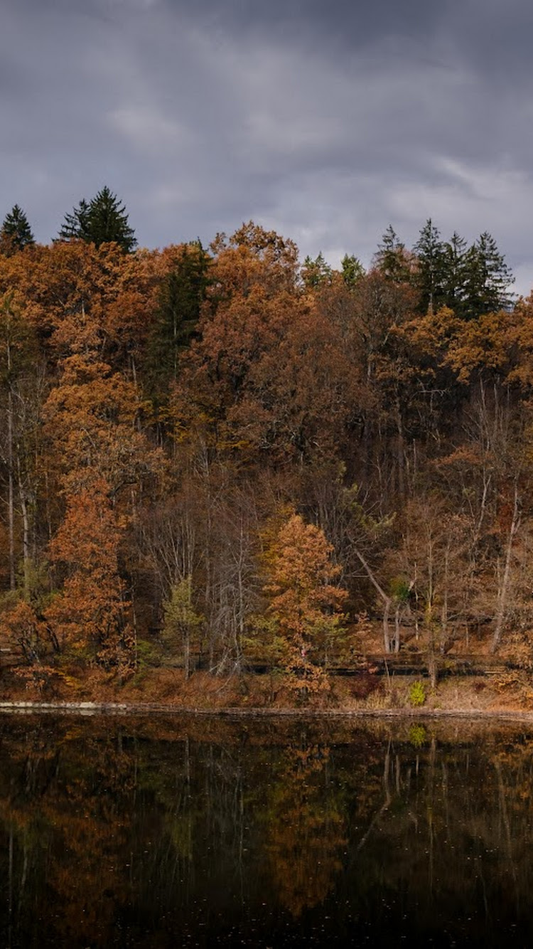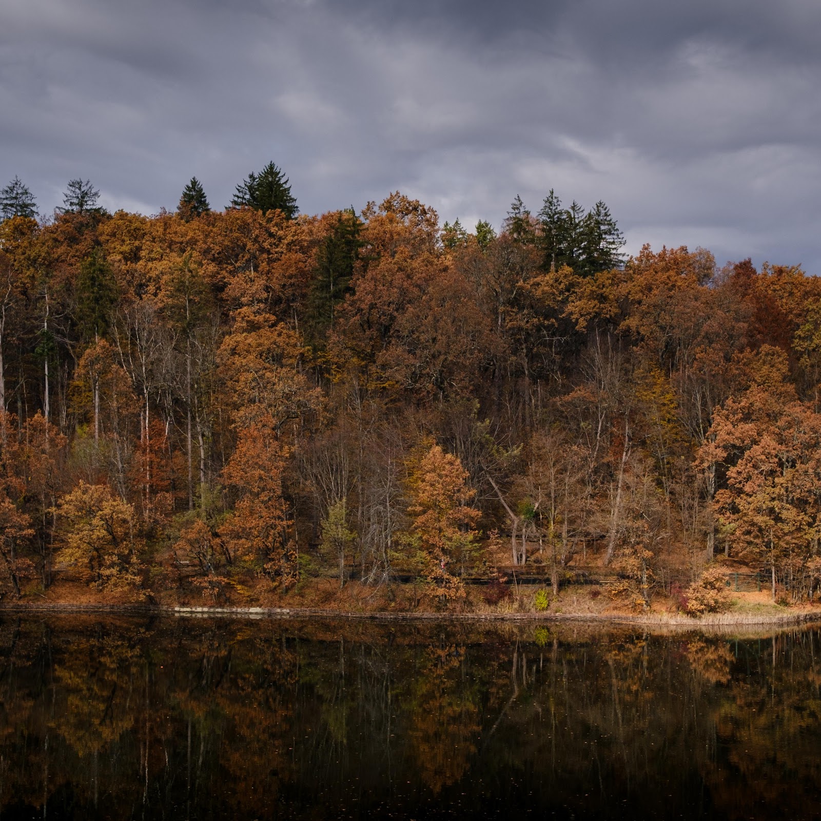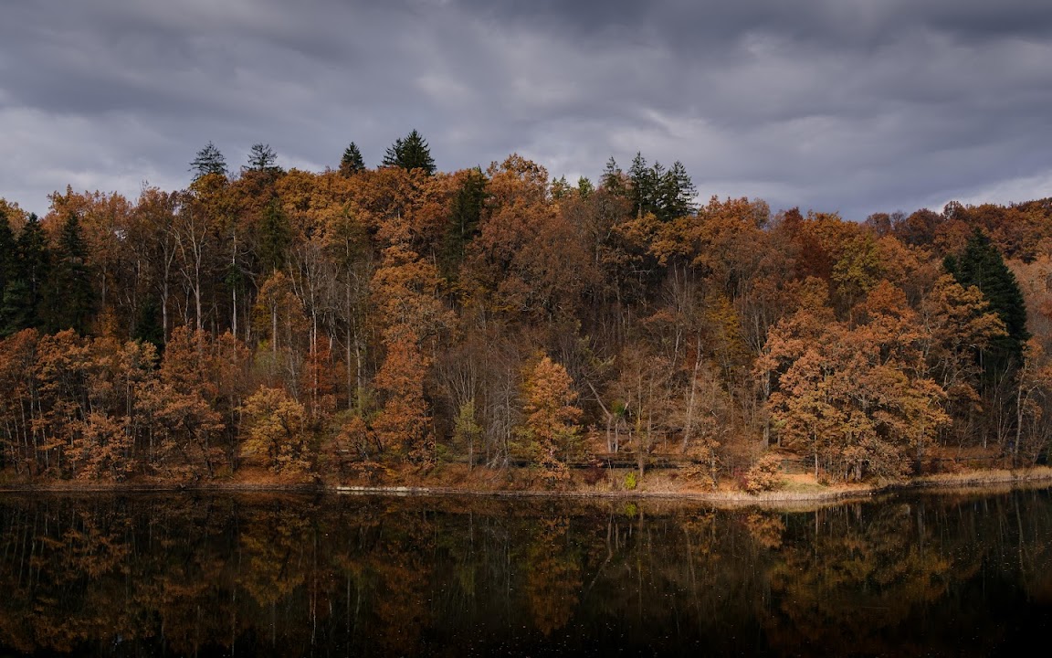 The autumn forest stands along a lake edge showing warm brown and orange leaves under a dramatic dark gray sky.