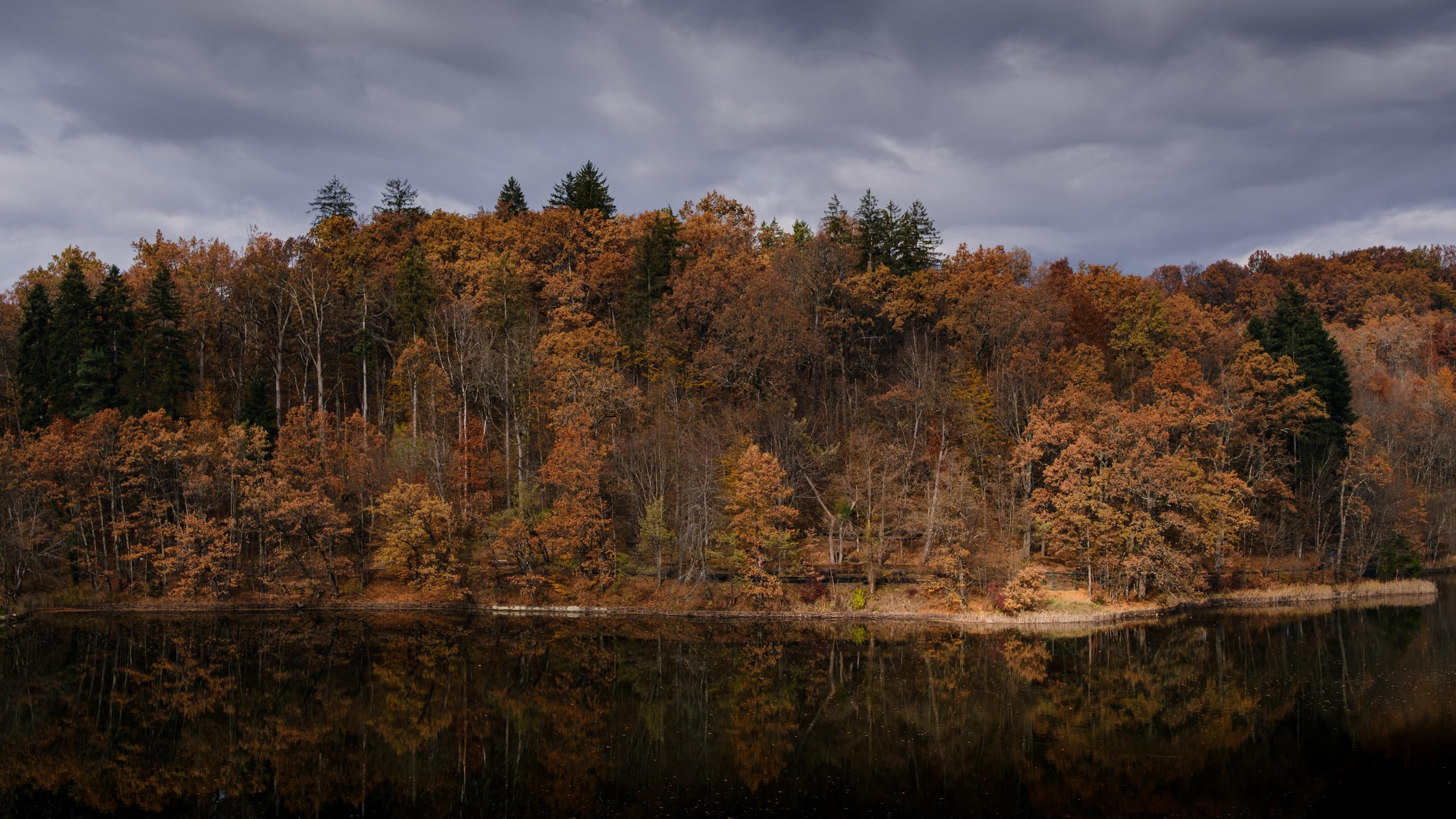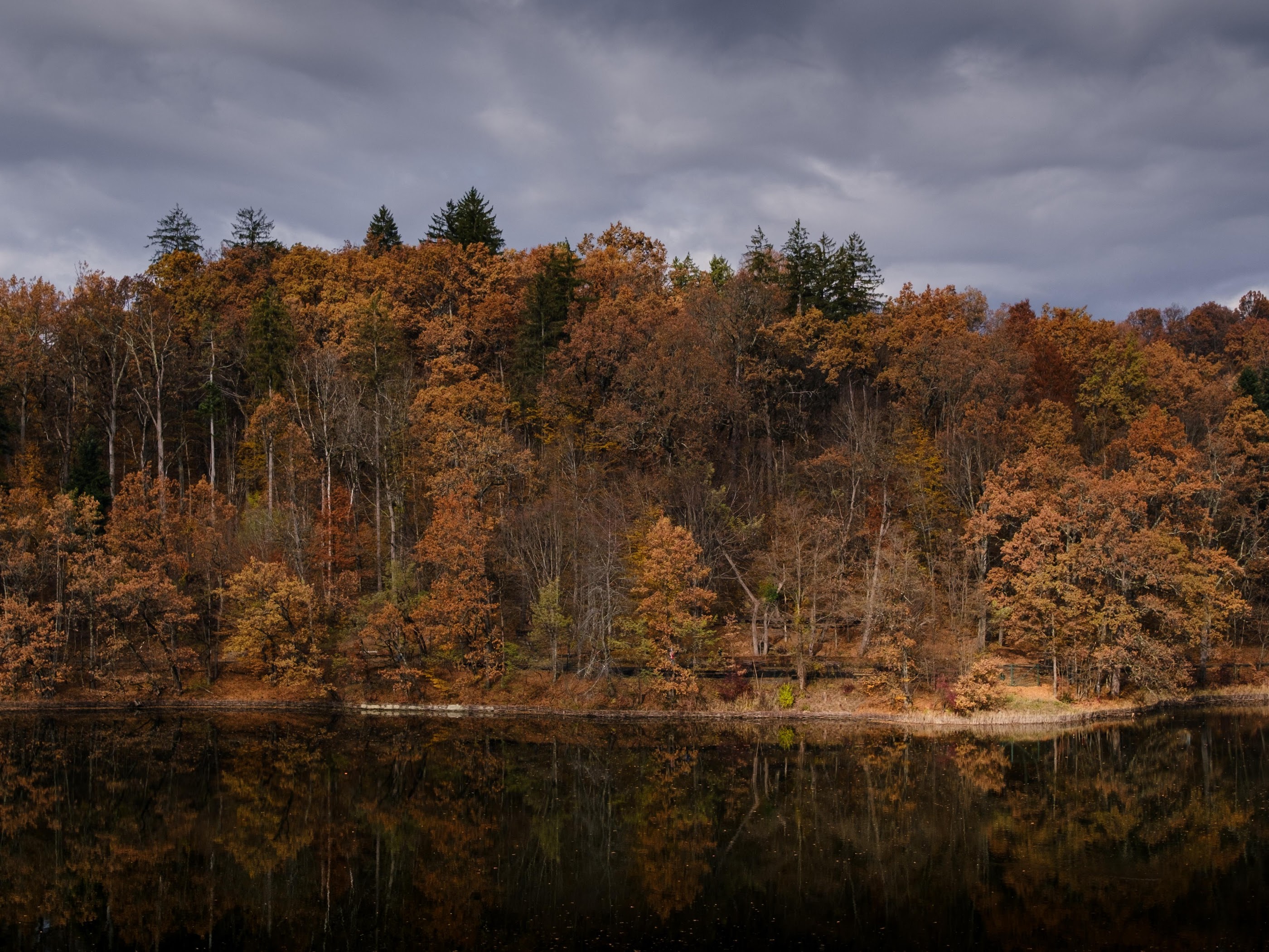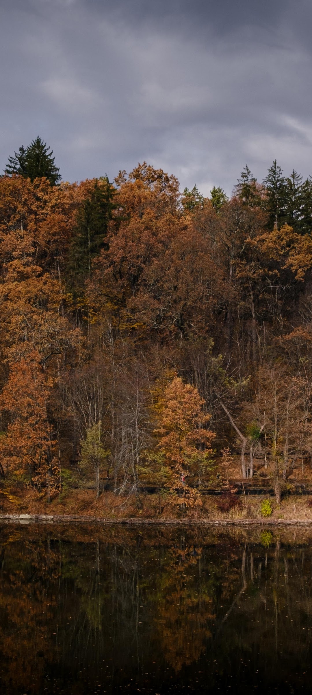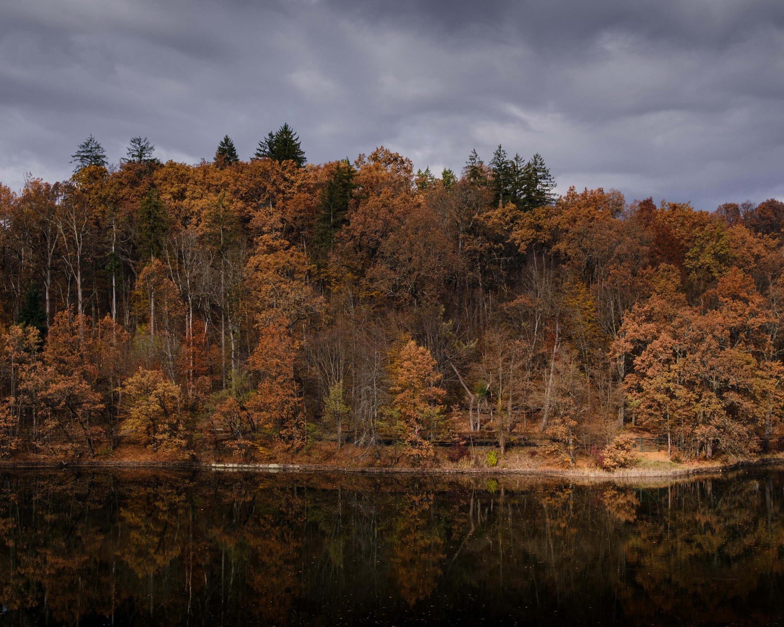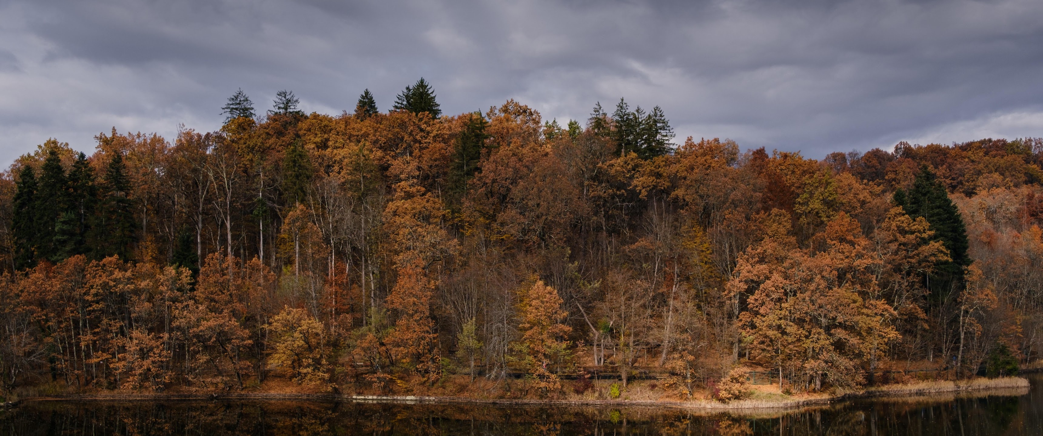The autumn forest stands along a lake edge showing warm brown and orange leaves under a dramatic dark gray sky.