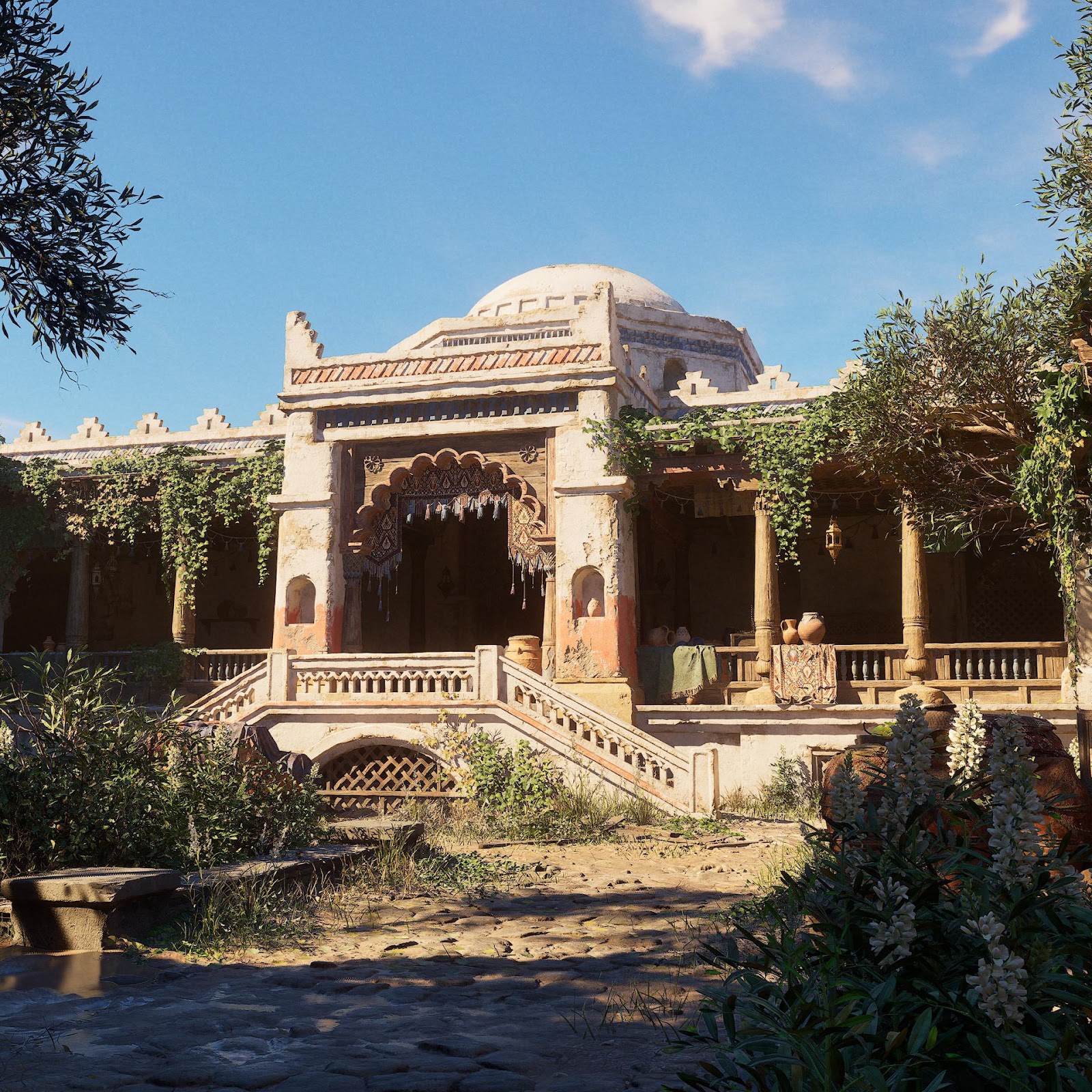 A beautifully detailed ancient palace stands in a sunny desert courtyard with lush greenery and thick vines climbing the walls.