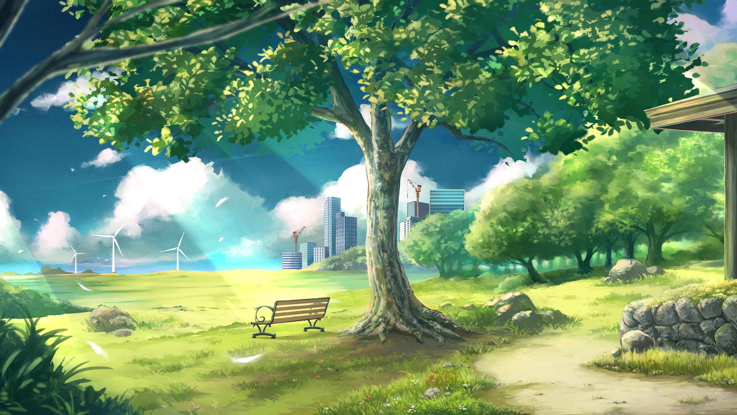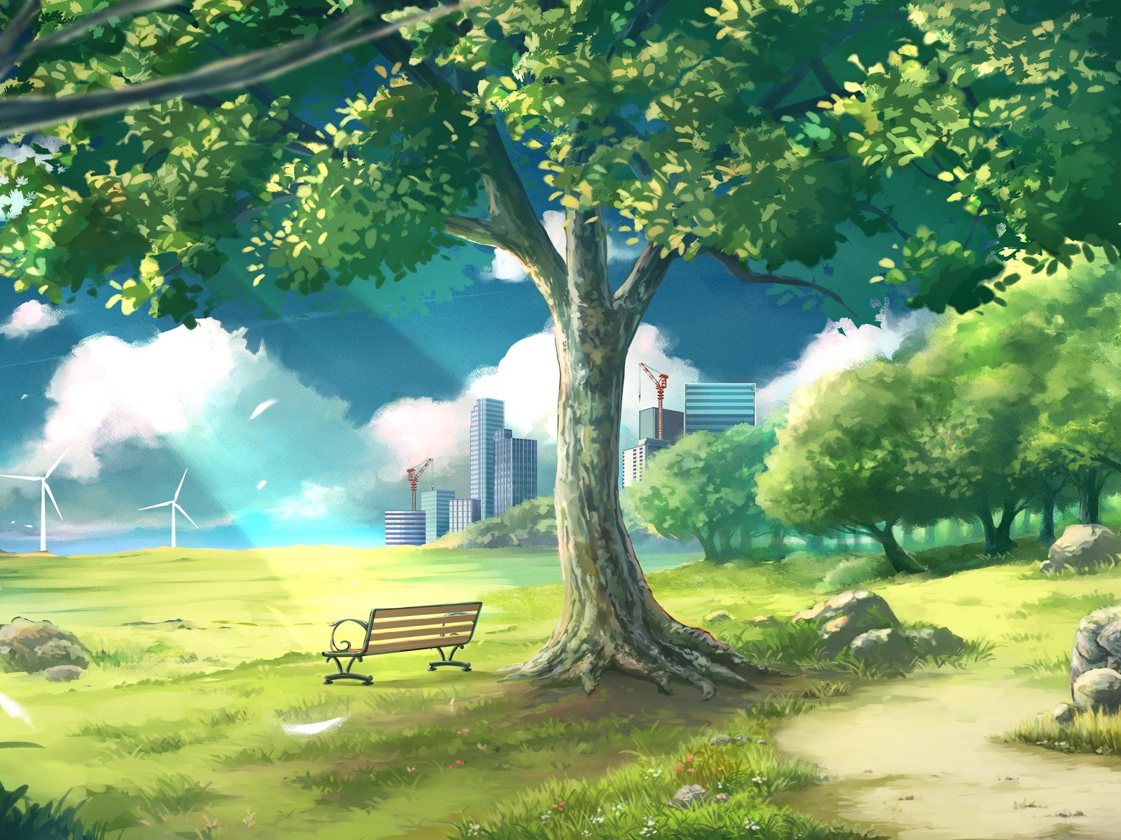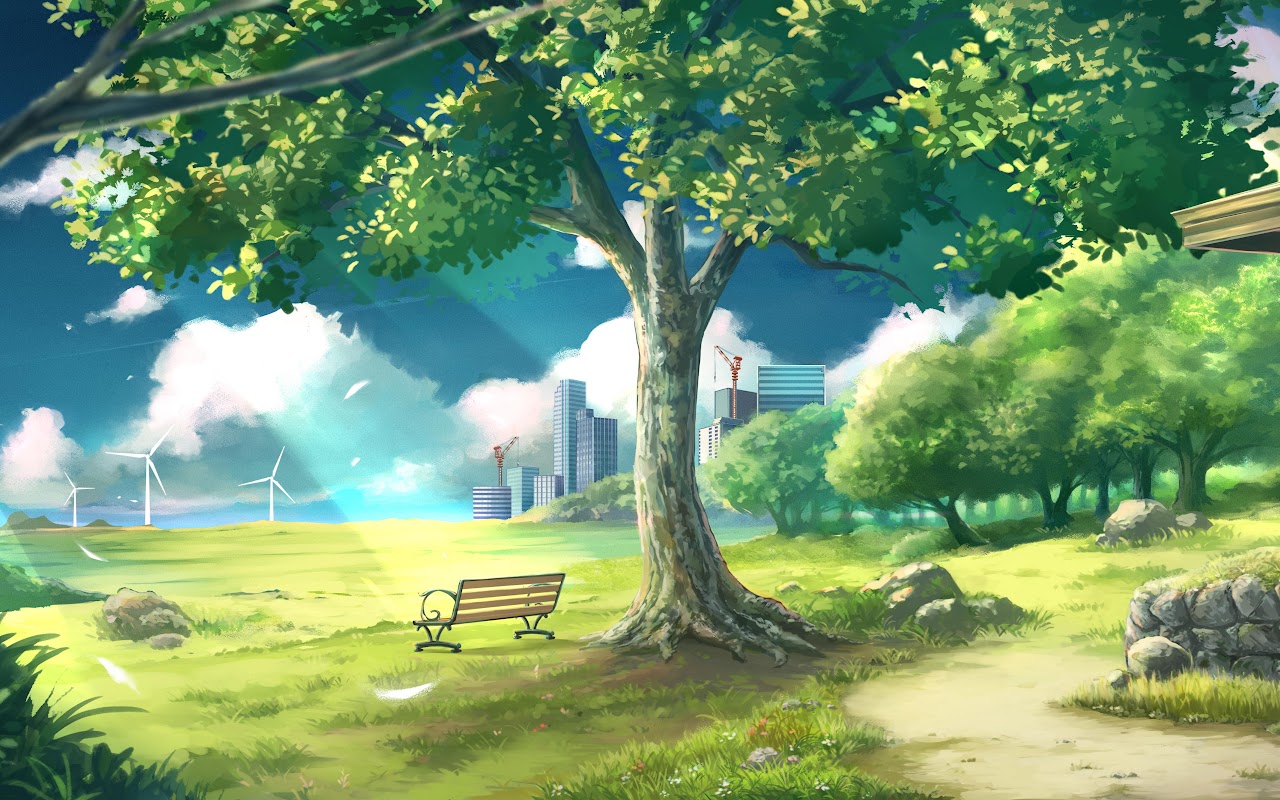 A park bench sits under a large green leafy tree with distant city skyscrapers and wind turbines visible under a bright blue sky.