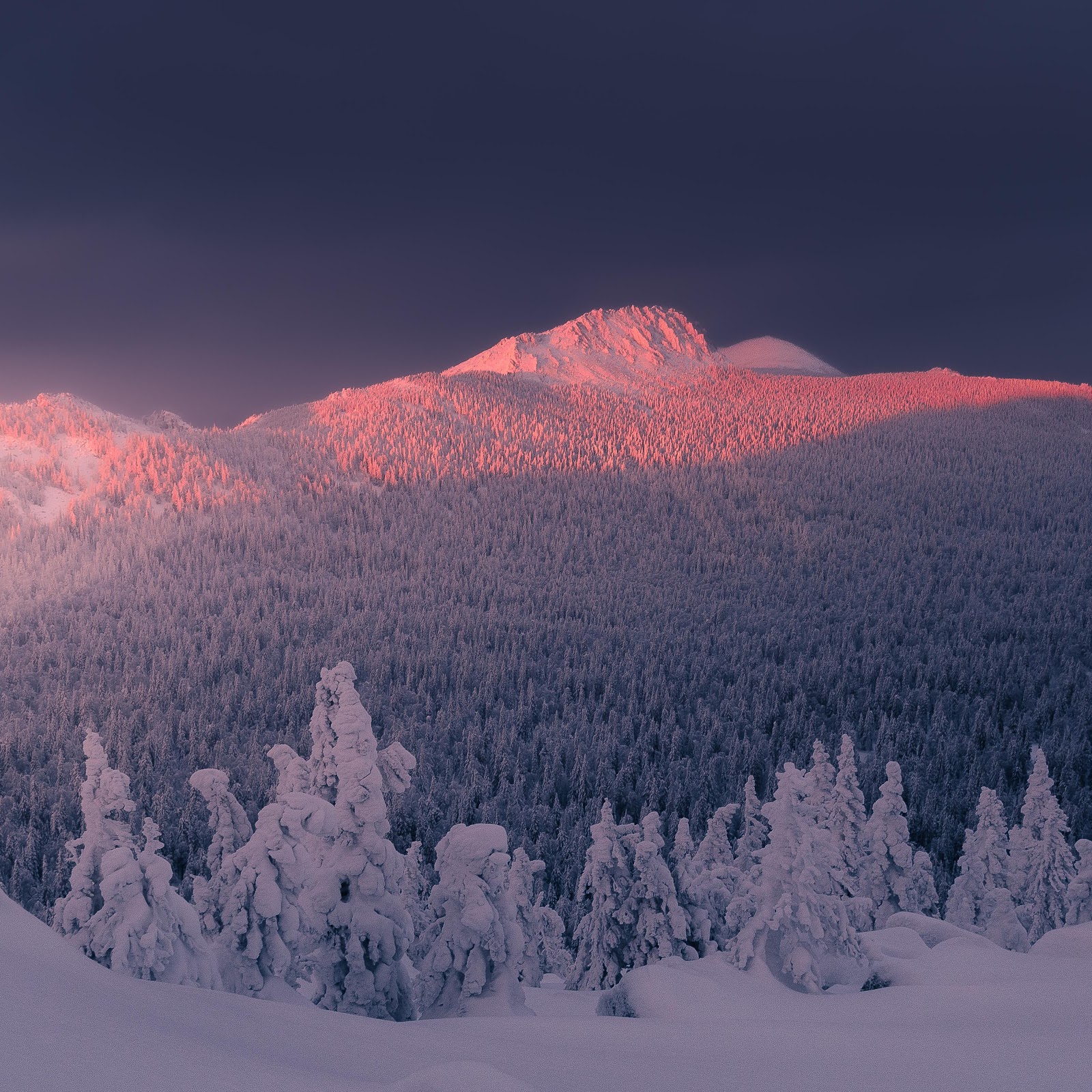 A vast snowy mountain forest shines with pink light under a dramatic purple and gray twilight sky.