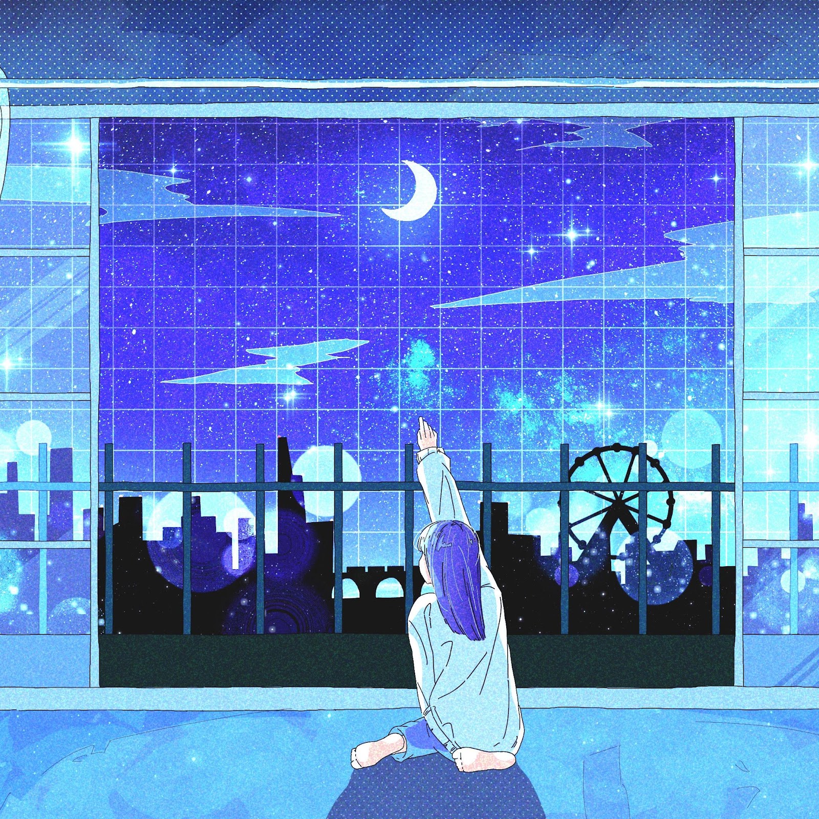 A person sits in a bedroom looking out a large window at a bright starry night sky over a vibrant city skyline.