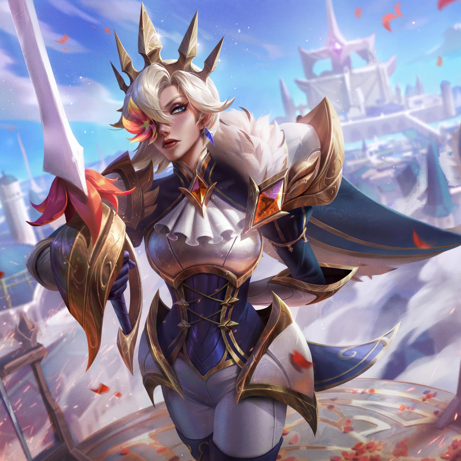 A regal warrior queen stands in ornate golden armor, holding a large sword over a vast white fantasy city setting.