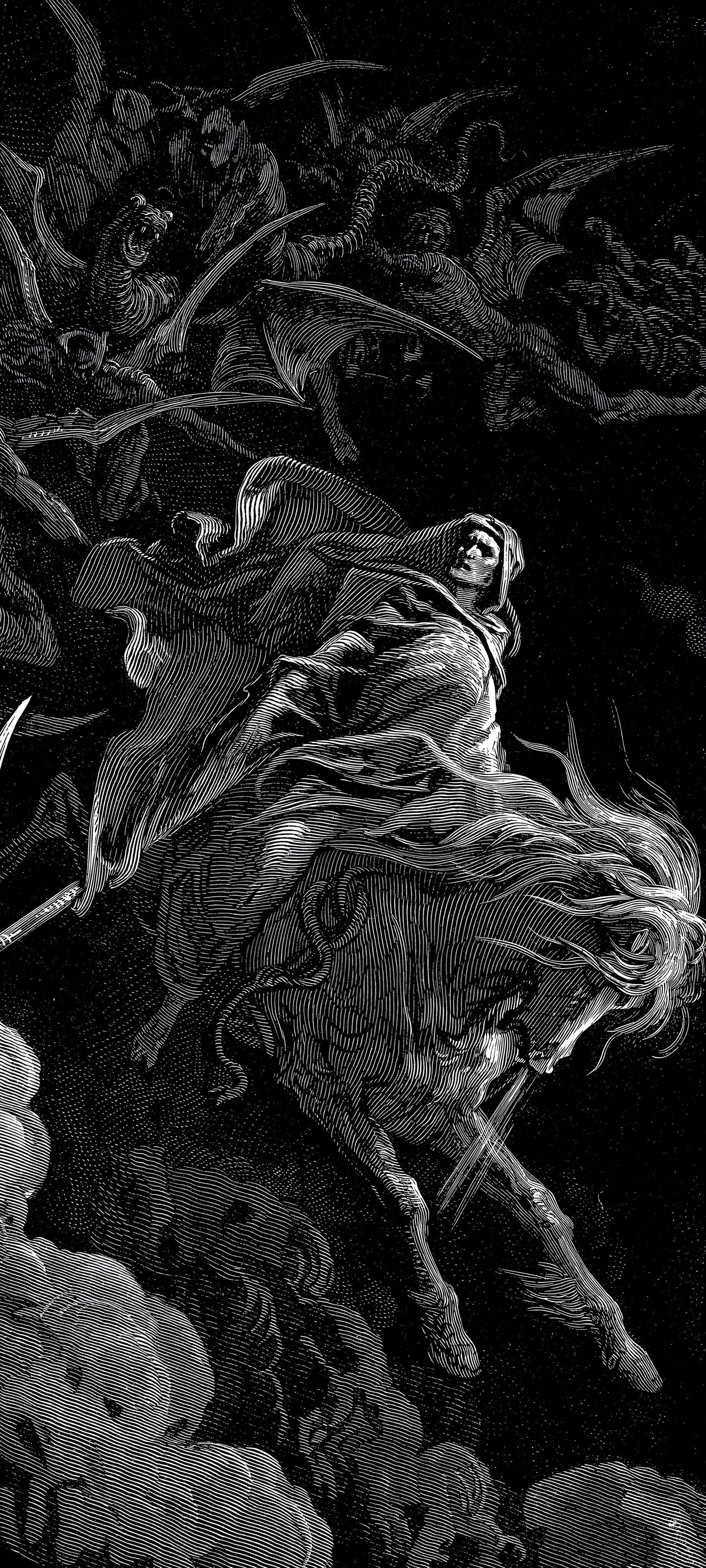 Rider Battles Demons In Darkness 2K iPhone Wallpaper A dramatic black and white engraving shows a cloaked man riding a horse down through the clouds while terrifying winged demons fly around him. du654 1.96 MB 1844x4096 Download original File Size: Dimensions: Resolution: 2K Format: Mobile ID: Black Black And White Classical Art Demon Engraving Gothic Horseman