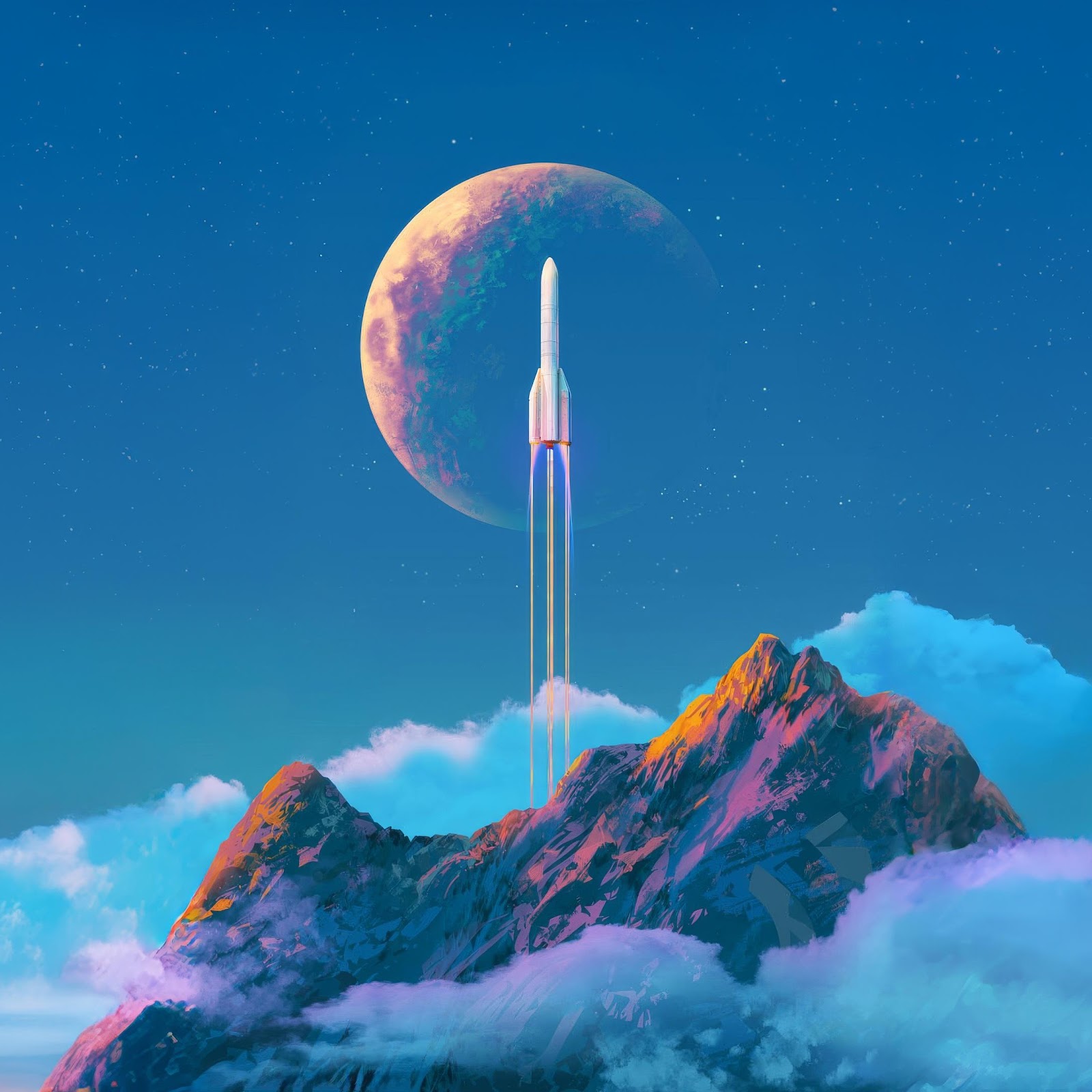 Rocket Launch Over Colorful Mountains - Sci-Fi Illustration 4K Wallpaper (5156x2160)