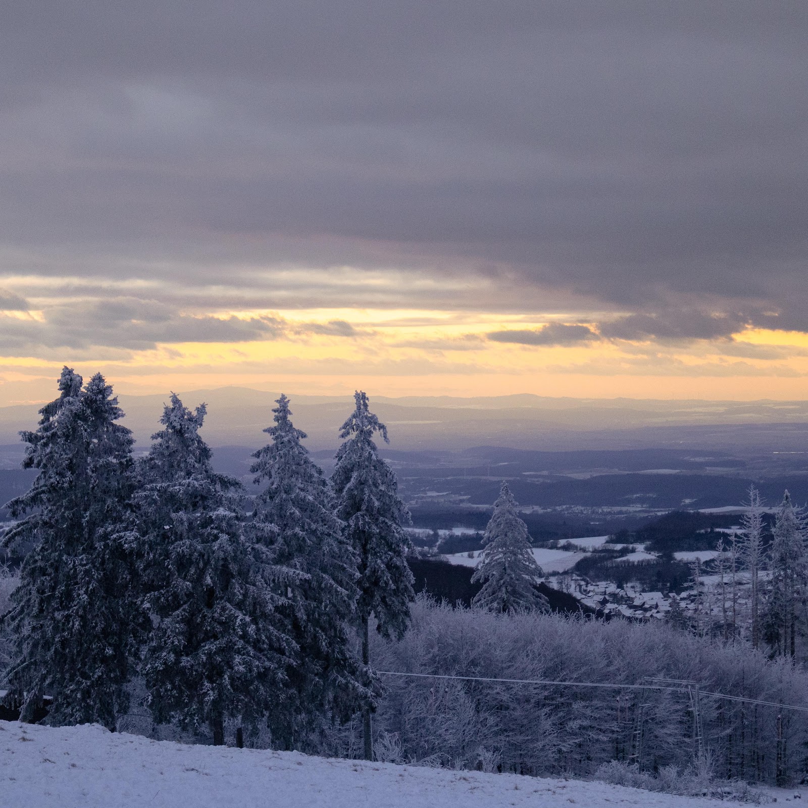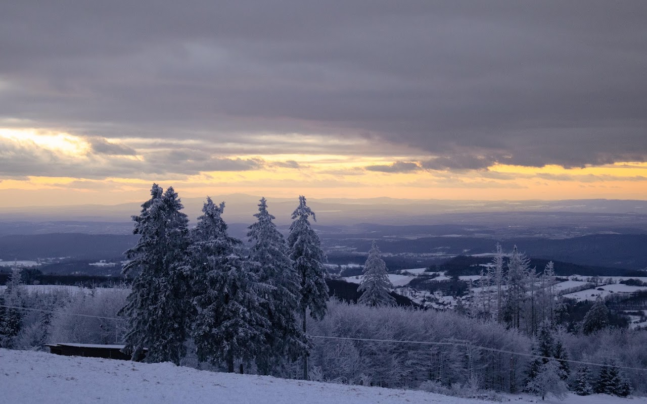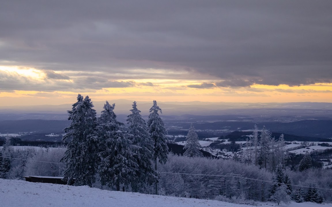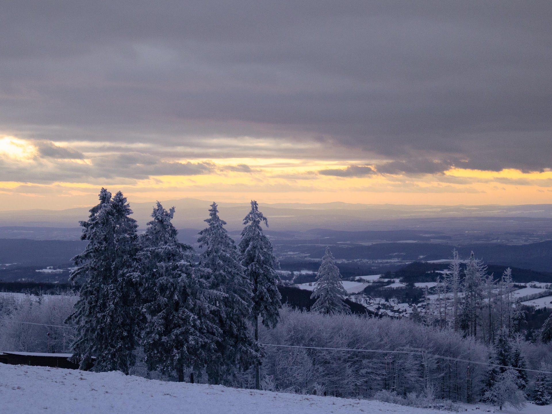 Snow-covered pine trees and rolling hills are visible from a high slope with a dramatic gray and orange winter sunset.
