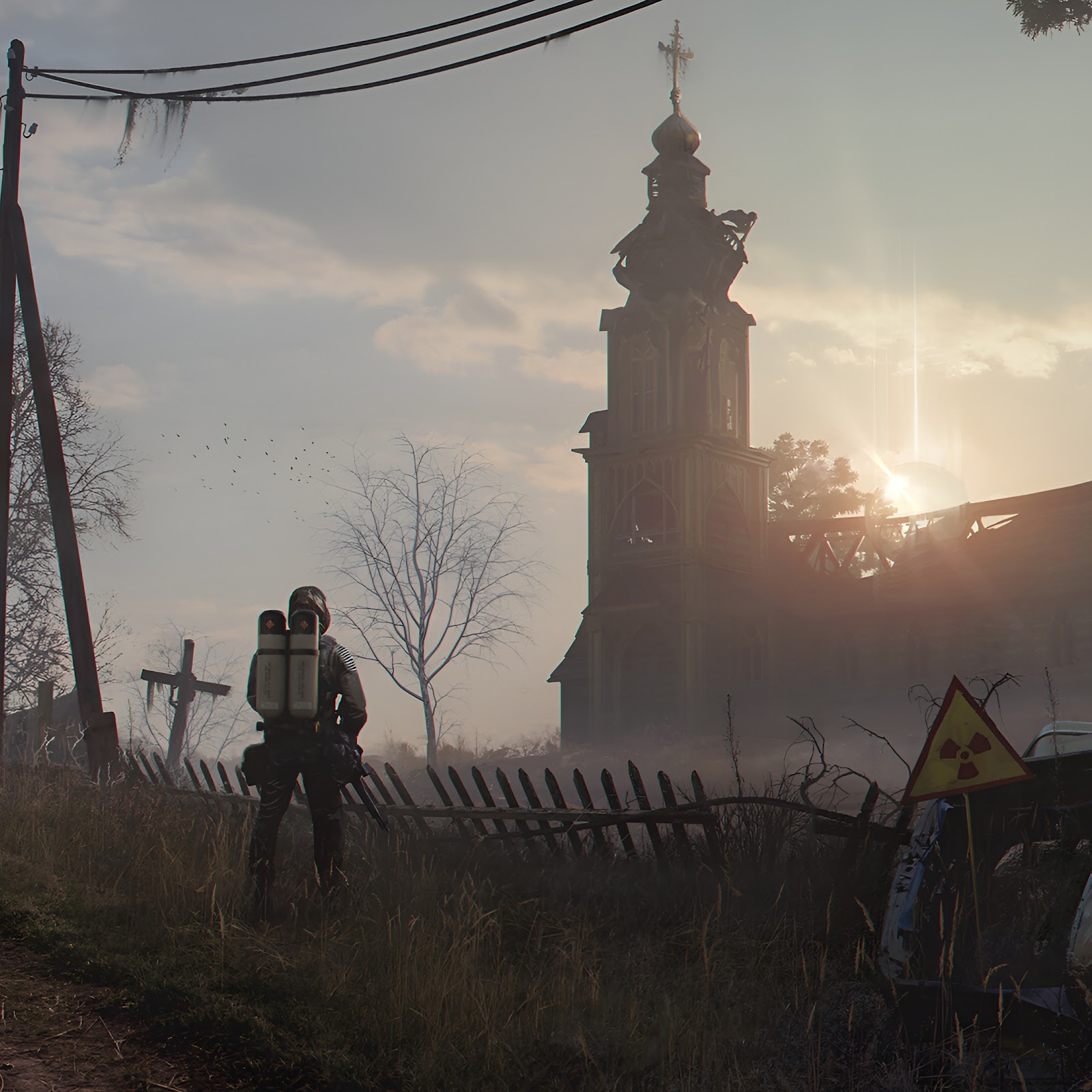 A stalker from S.T.A.L.K.E.R. 2 stands on a grassy path overlooking a ruined church tower with sunlight bursting through the gloomy sky.