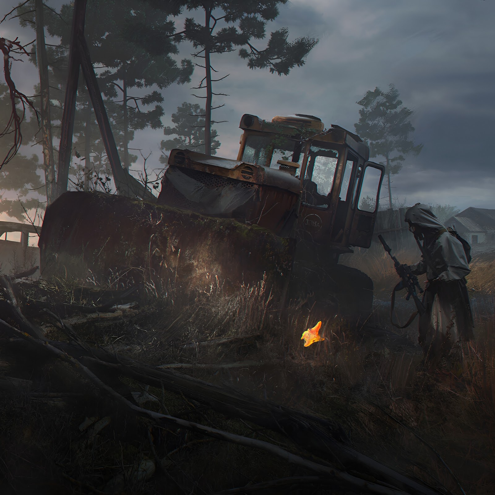 A Stalker, wearing a hooded suit, stands near a rusted bulldozer holding a rifle in the gloomy Exclusion Zone.