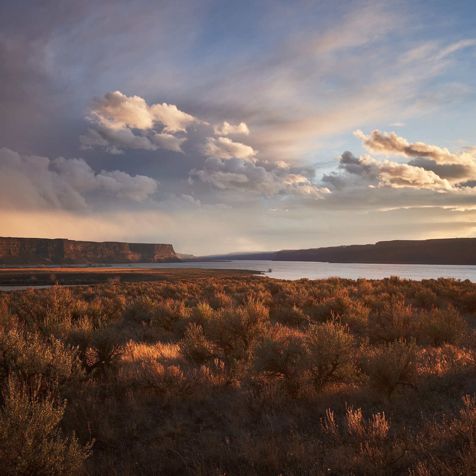 A wide dry plain with golden brush spreads out next to a canyon cliff and large river under dramatic storm clouds.