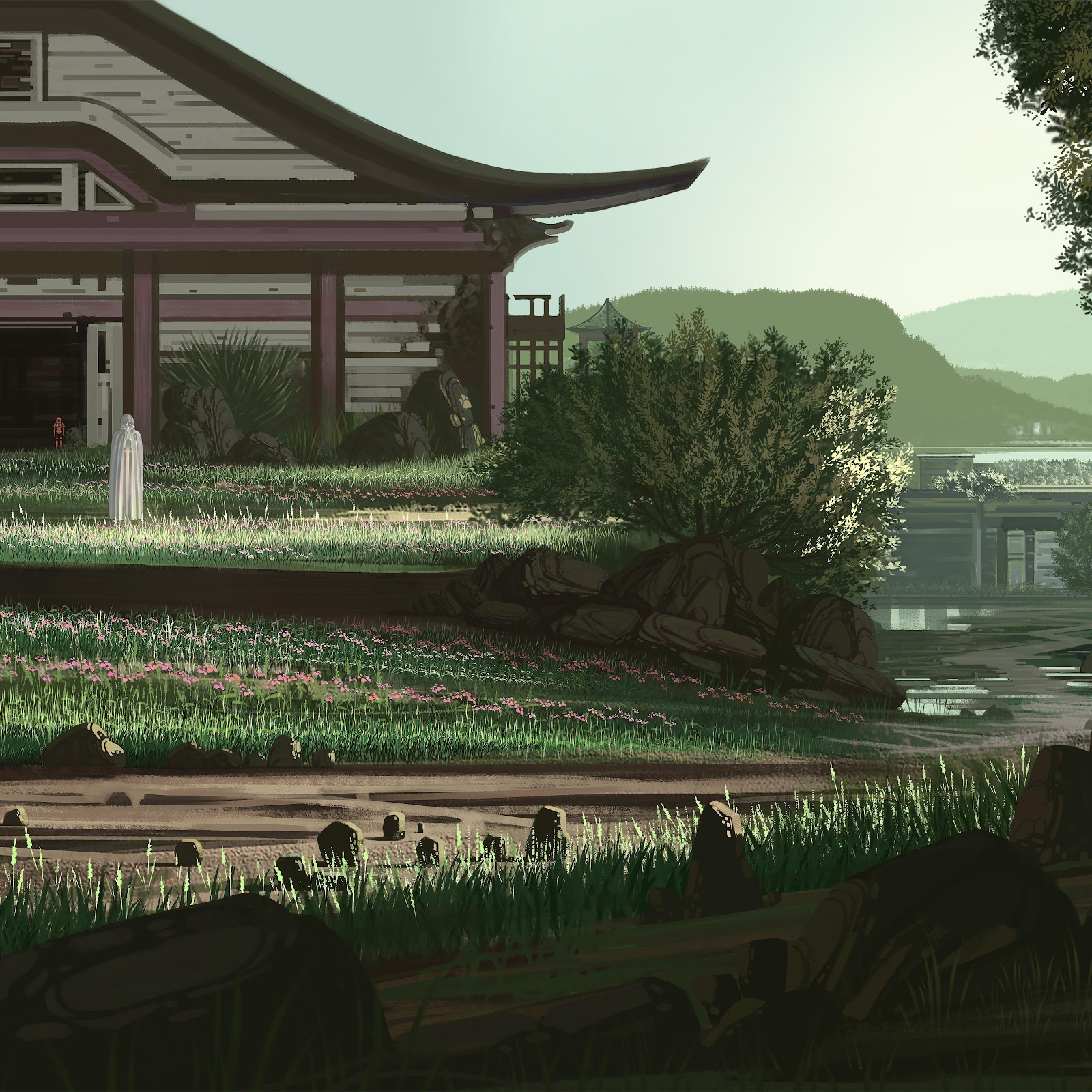 A small figure in a white robe stands outside a traditional Japanese-style temple house surrounded by lush green grass and dark, rocky terrain.