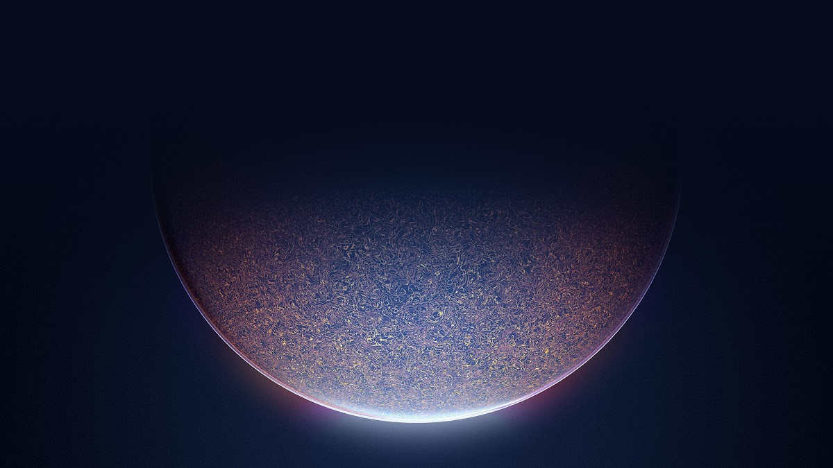 A vibrant cosmic planet covered in swirling golden texture hangs in the deep darkness of space with a soft purple glow.