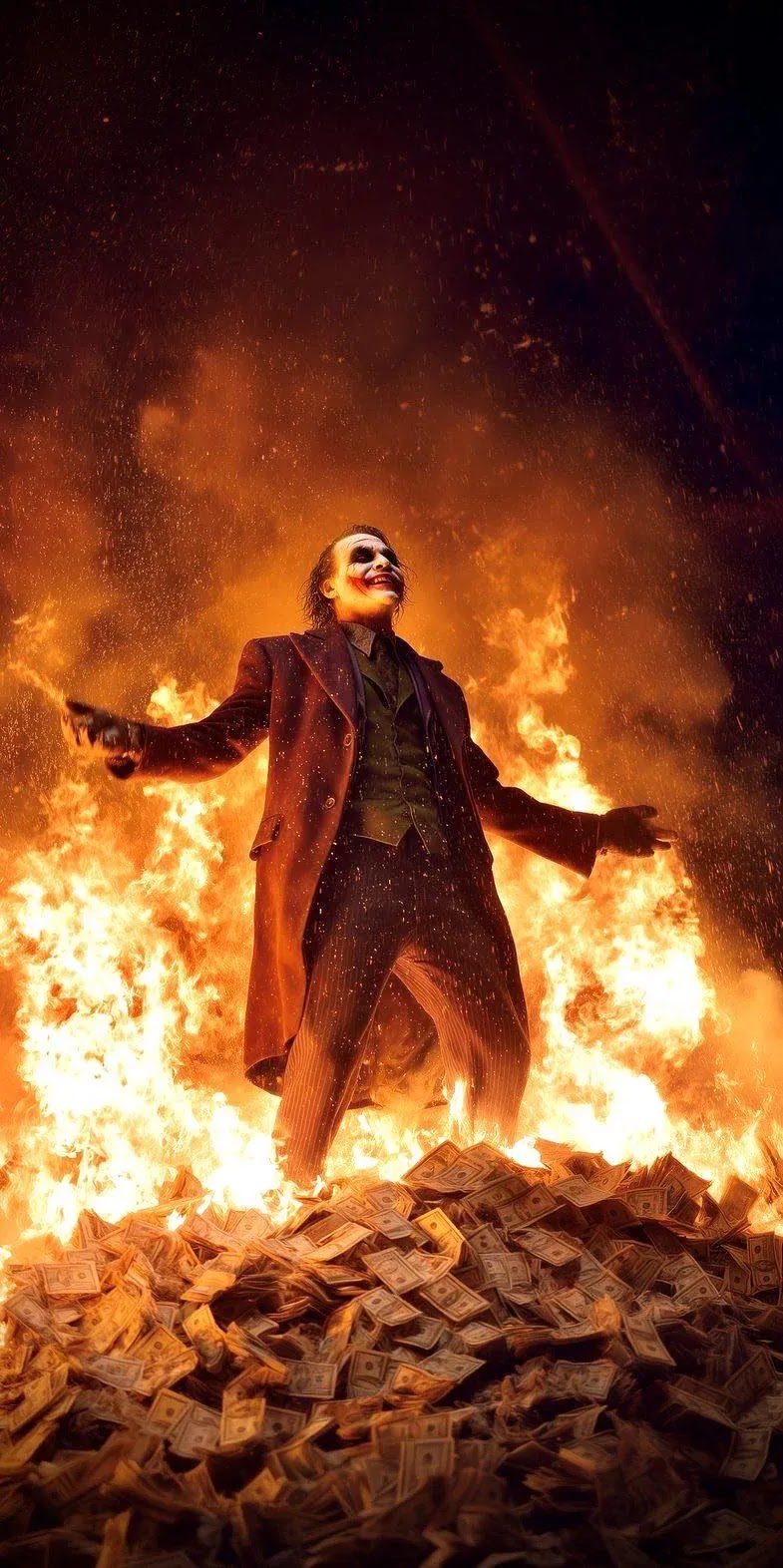 The Joker Burns Money Pile iPhone Wallpaper The Joker from The Dark Knight stands on a giant pile of cash while surrounded by intense orange flames in a chaotic scene. eo708 187.09 KB 785x1572 Download original File Size: Dimensions: Format: Mobile ID: Batman Dark Knight Fire Heath Ledger Joker Orange Villain
