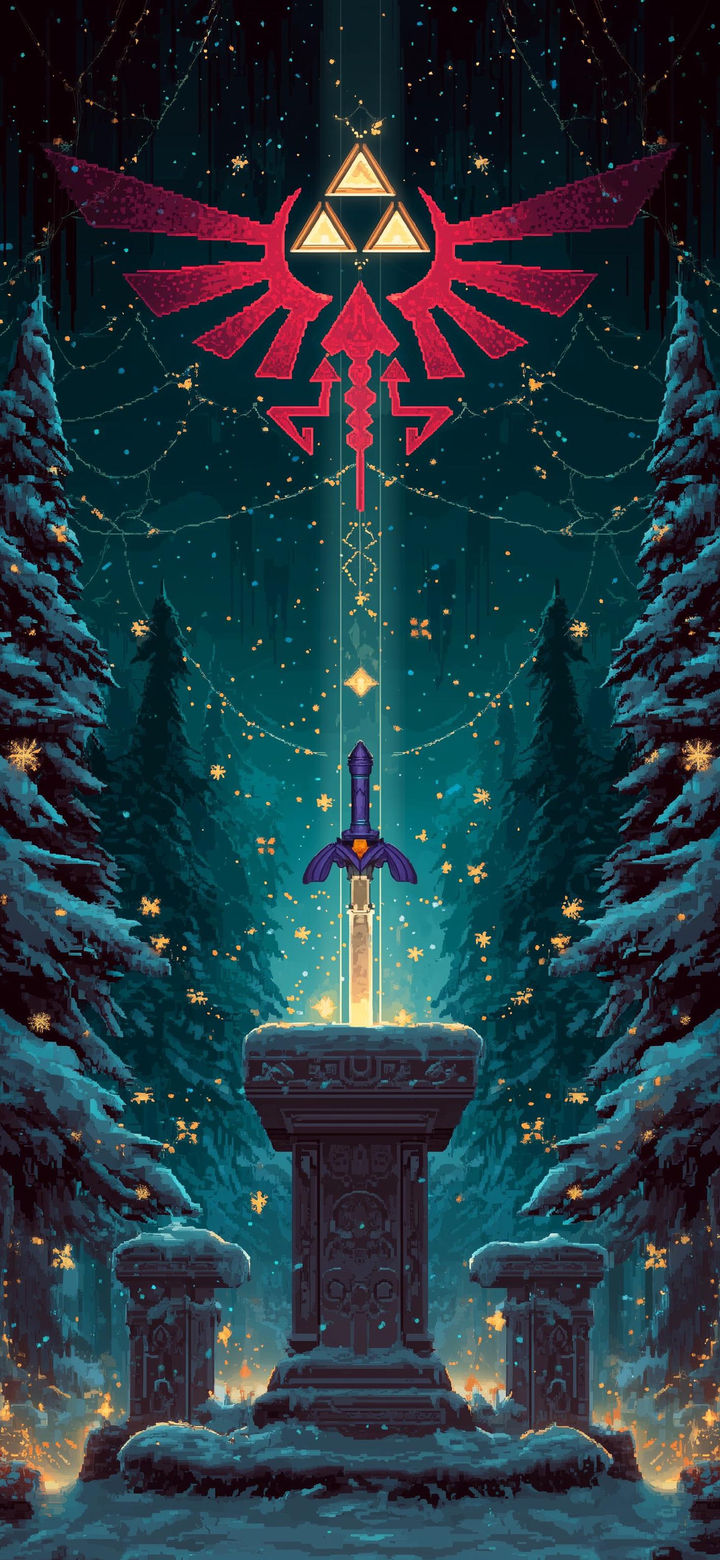 The Legend Of Zelda Winter Sword Full HD iPhone Wallpaper The Master Sword stands glowing on a stone pedestal in a magical, snowy forest under the iconic Hylian Crest. lg022 536.29 KB 1417x3070 Download original File Size: Dimensions: Resolution: Full HD Format: Mobile ID: Blue Fantasy Gaming Master Sword Pixel Art Triforce Winter Forest Zelda