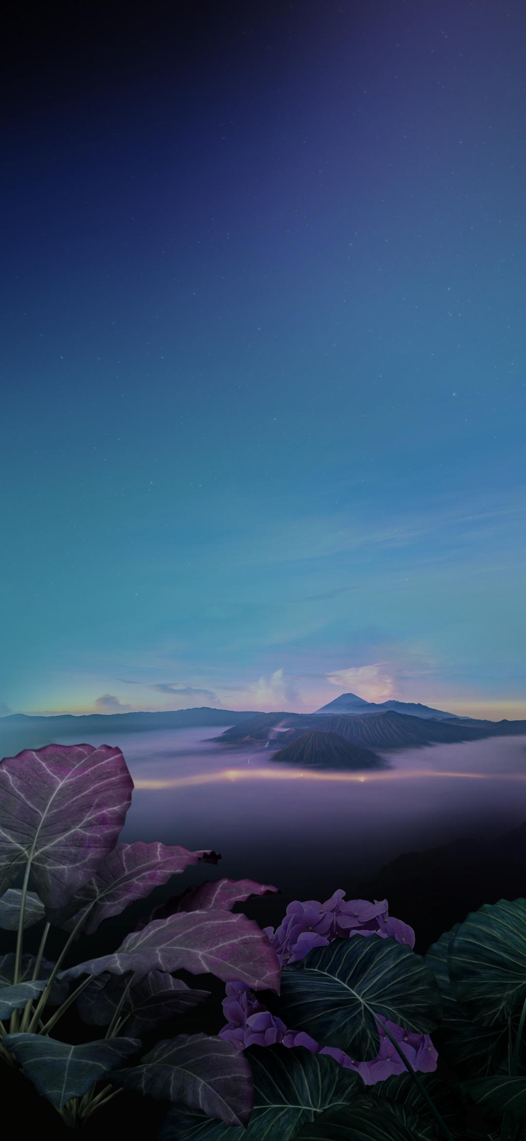 Large purple leaves frame a stunning volcanic landscape covered in thick fog under a vibrant twilight sky.