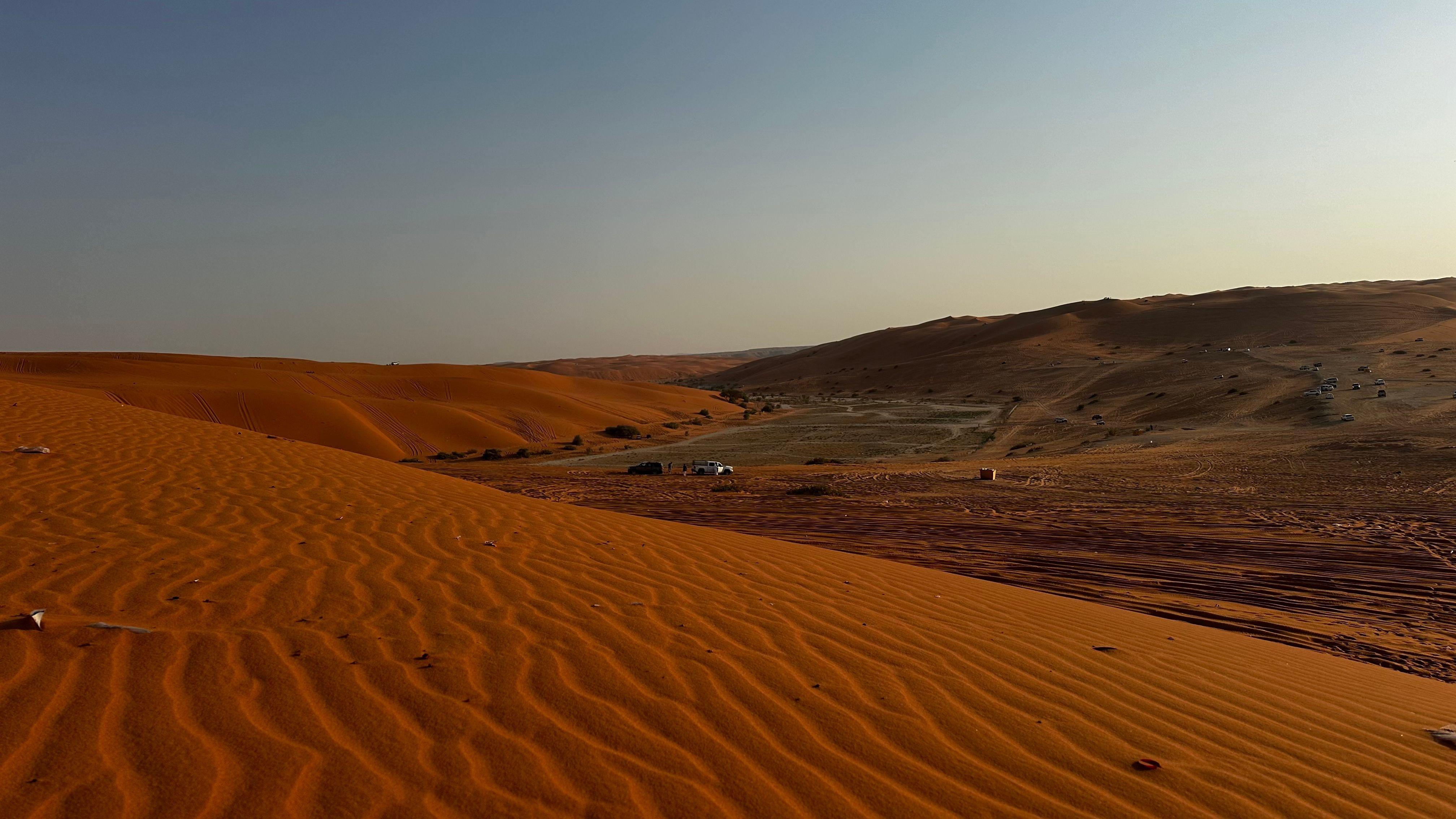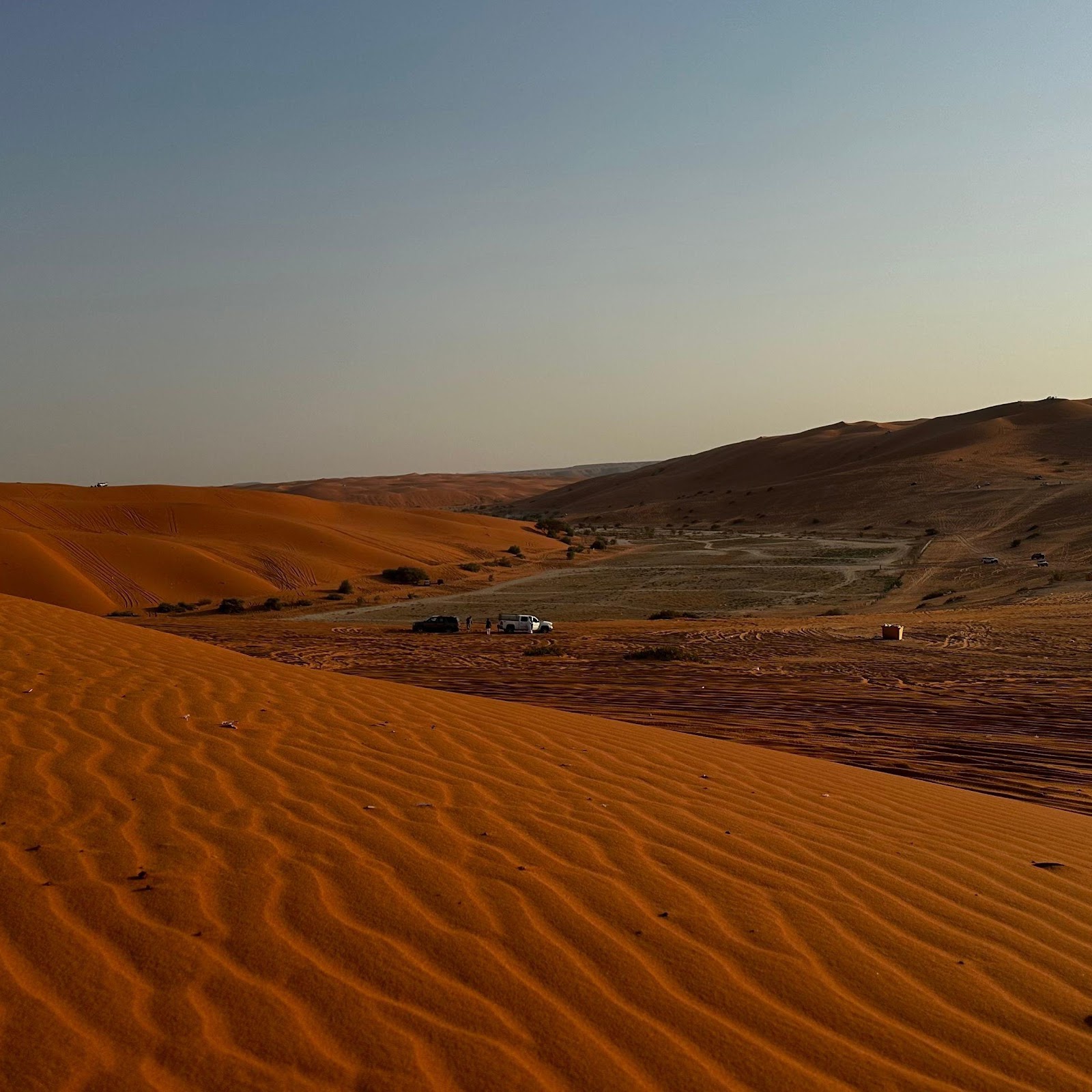 Massive orange sand dunes roll across a wide desert valley with cars parked below under a pale blue sky.