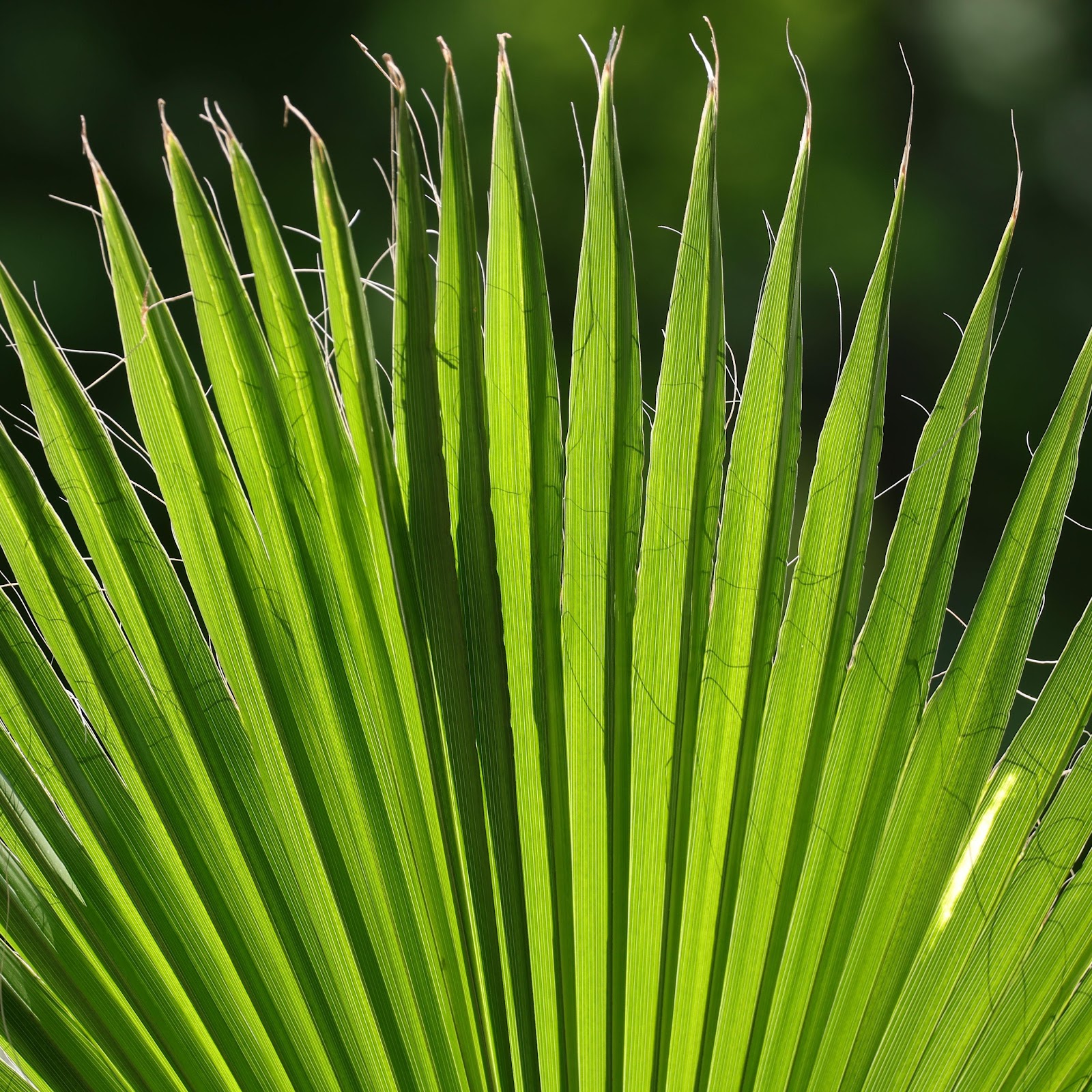 A vibrant green fan palm frond stands against a dark background, highlighted by strong sunlight showing detailed texture.