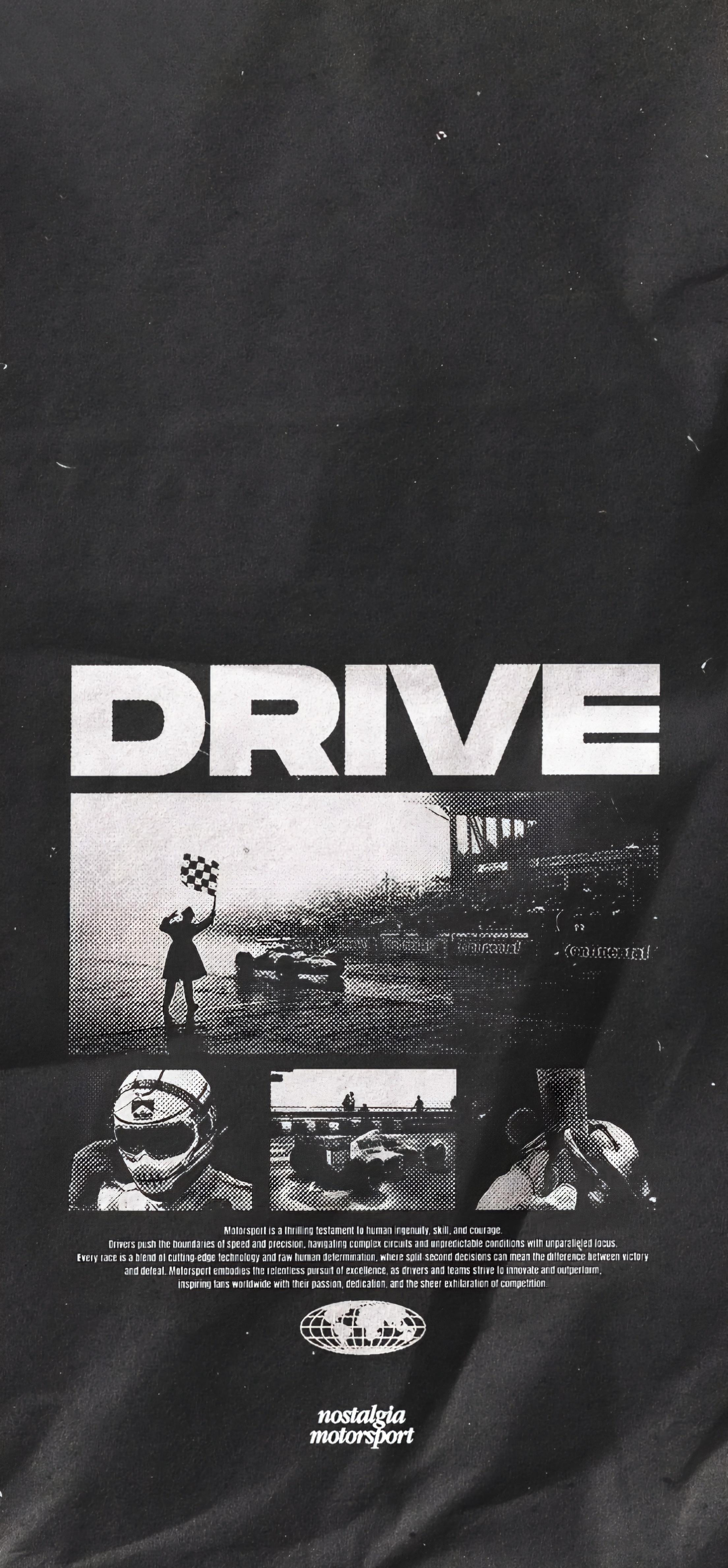 A vintage motorsports graphic design poster shows race scenes and the large white word DRIVE with a gritty aesthetic.
