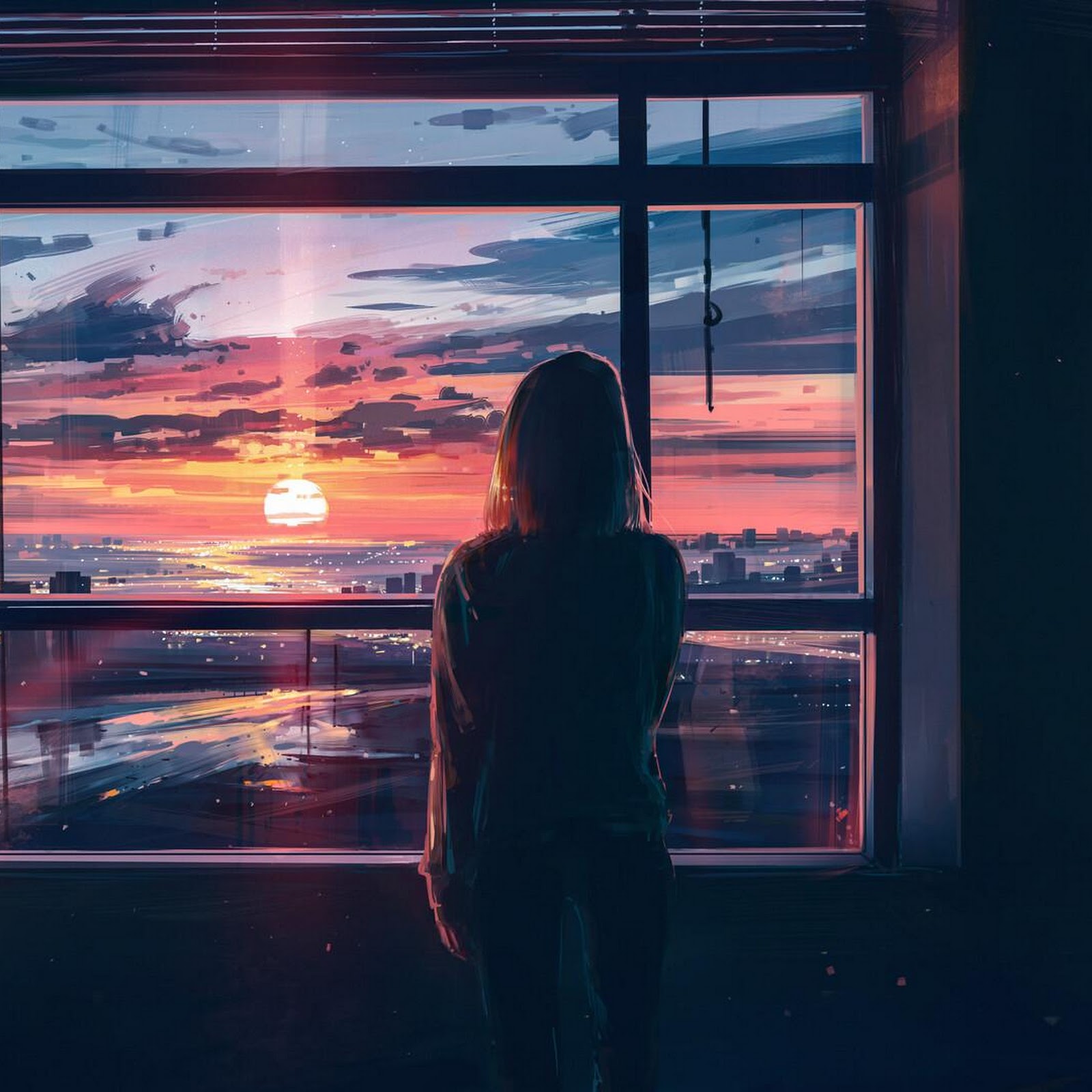 A lonely person stands silhouetted in a dark room looking out a large window at a breathtaking, colorful city sunset.