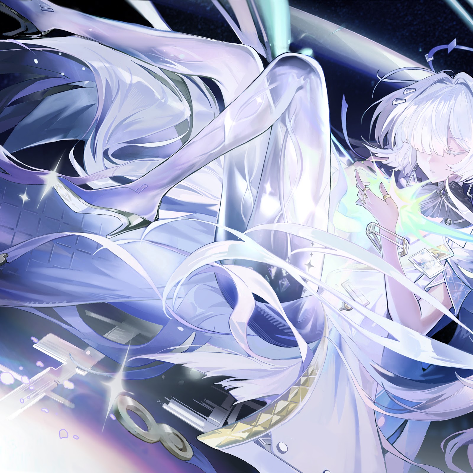 A white-haired female character from Wuthering Waves floats through space wearing flowing white clothes with a bright cosmic glow.