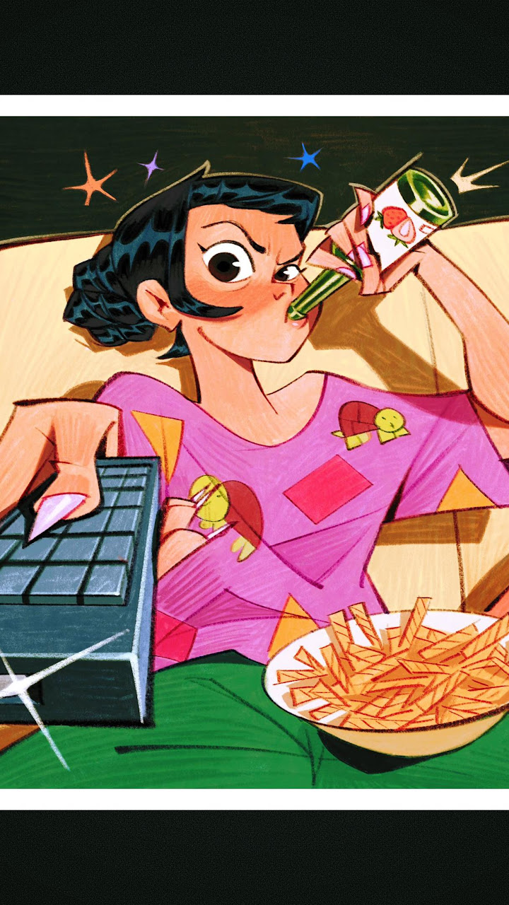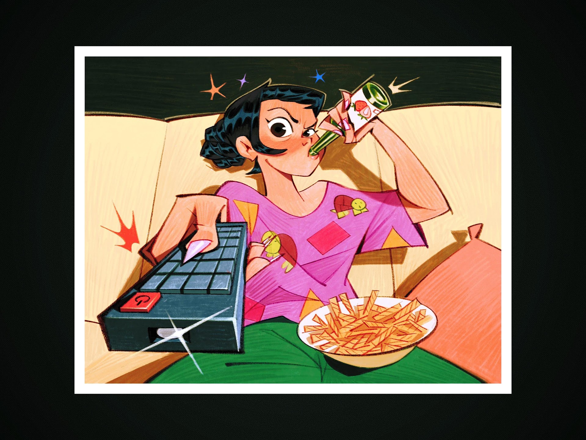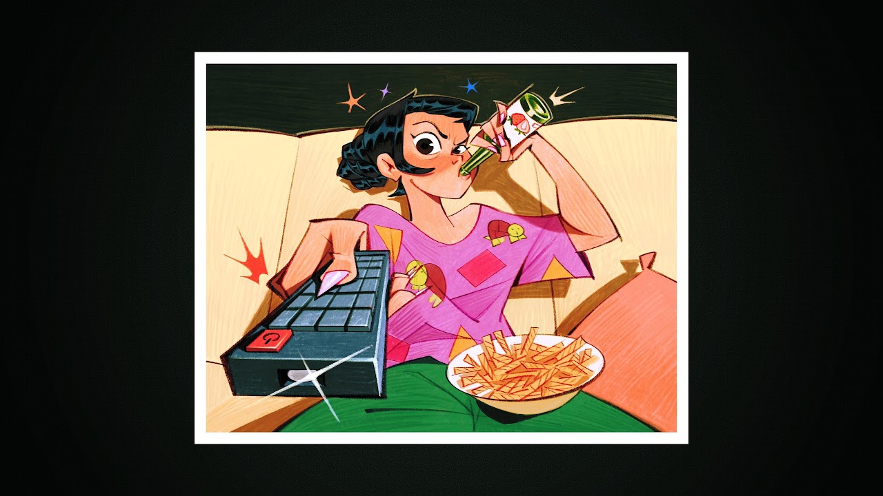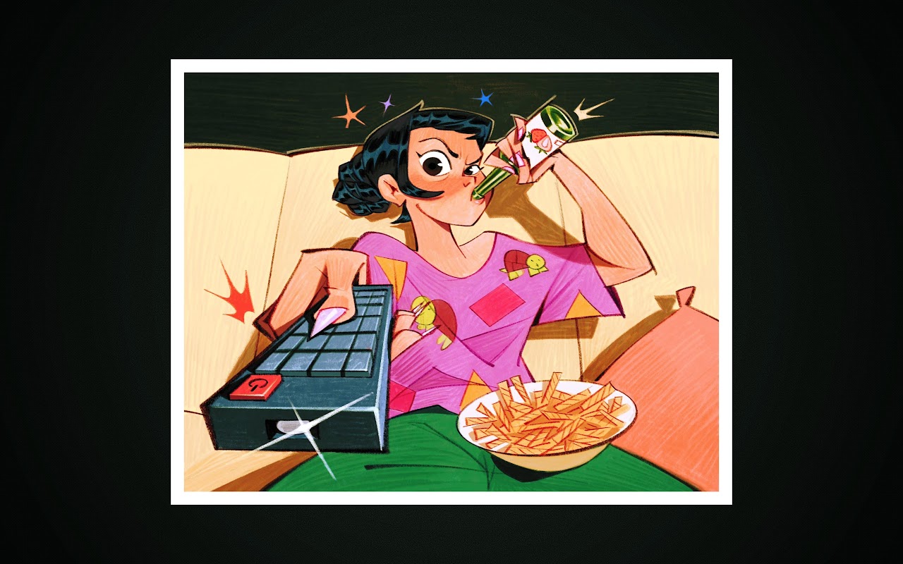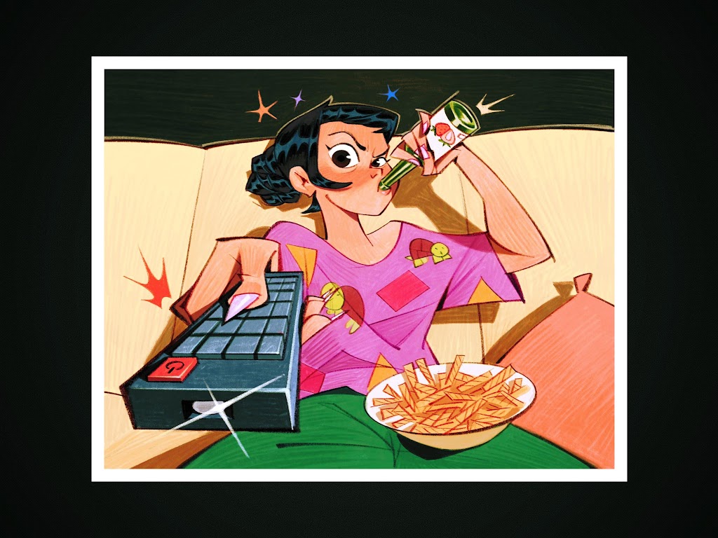 A cartoon woman lounges on a couch aggressively changing the channel with a remote and drinking a soda next to a bowl of fries, showing a casual vibe.
