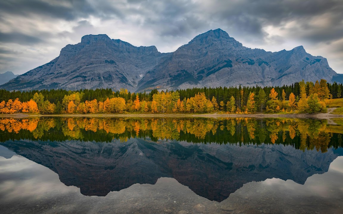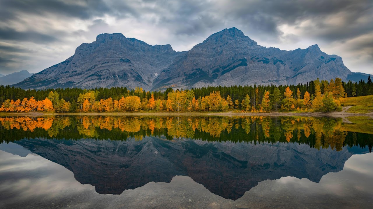 Large gray mountains stand tall over a calm lake with vibrant autumn trees reflecting on the water's surface under a cloudy sky.