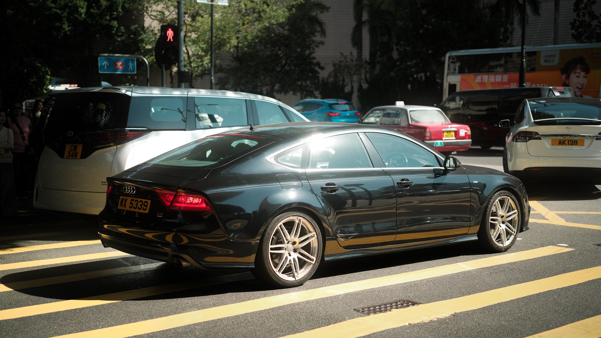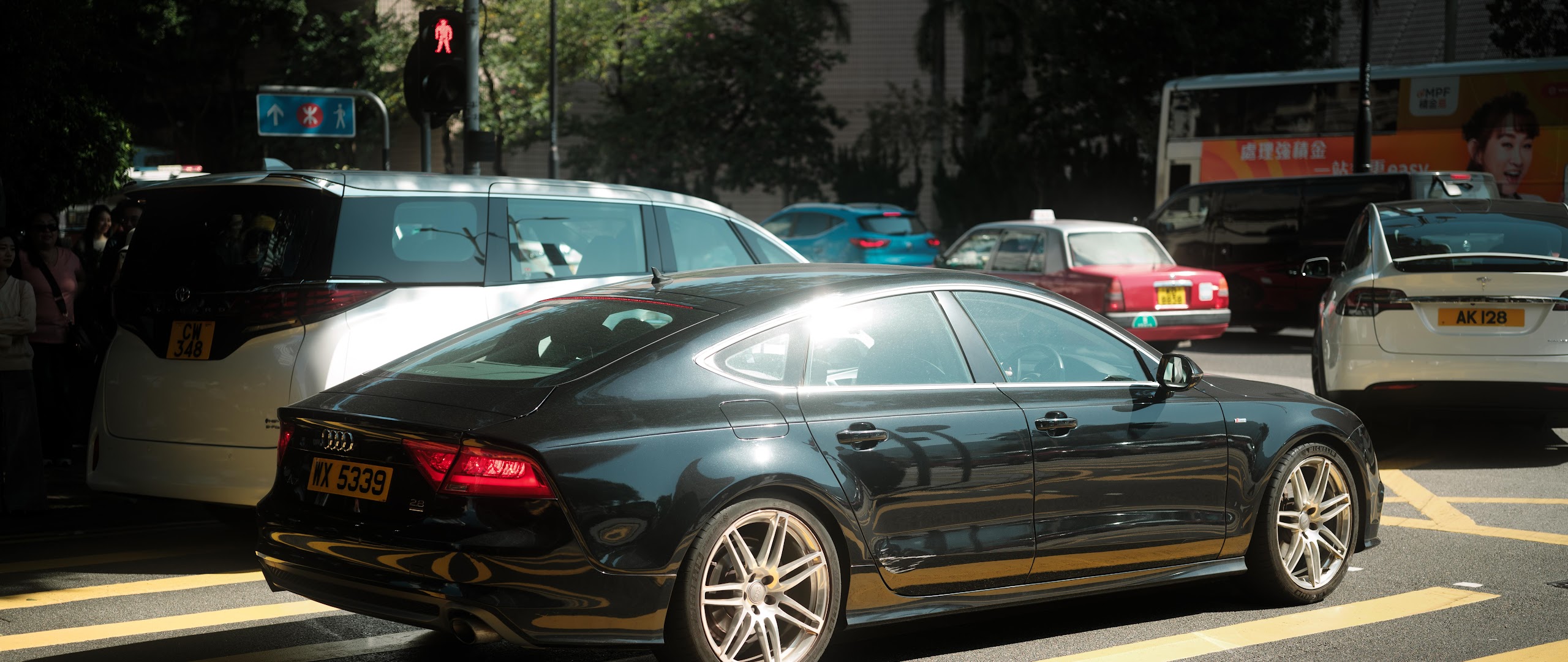 A sleek black Audi A7 drives through a busy Hong Kong street intersection with sunlight reflecting off its side during a warm afternoon in the city.