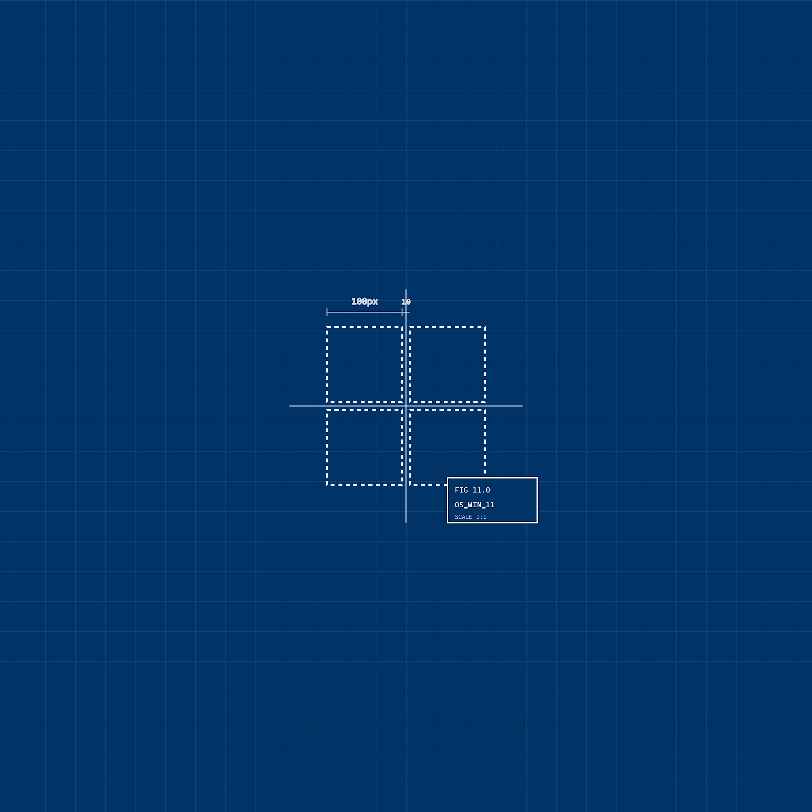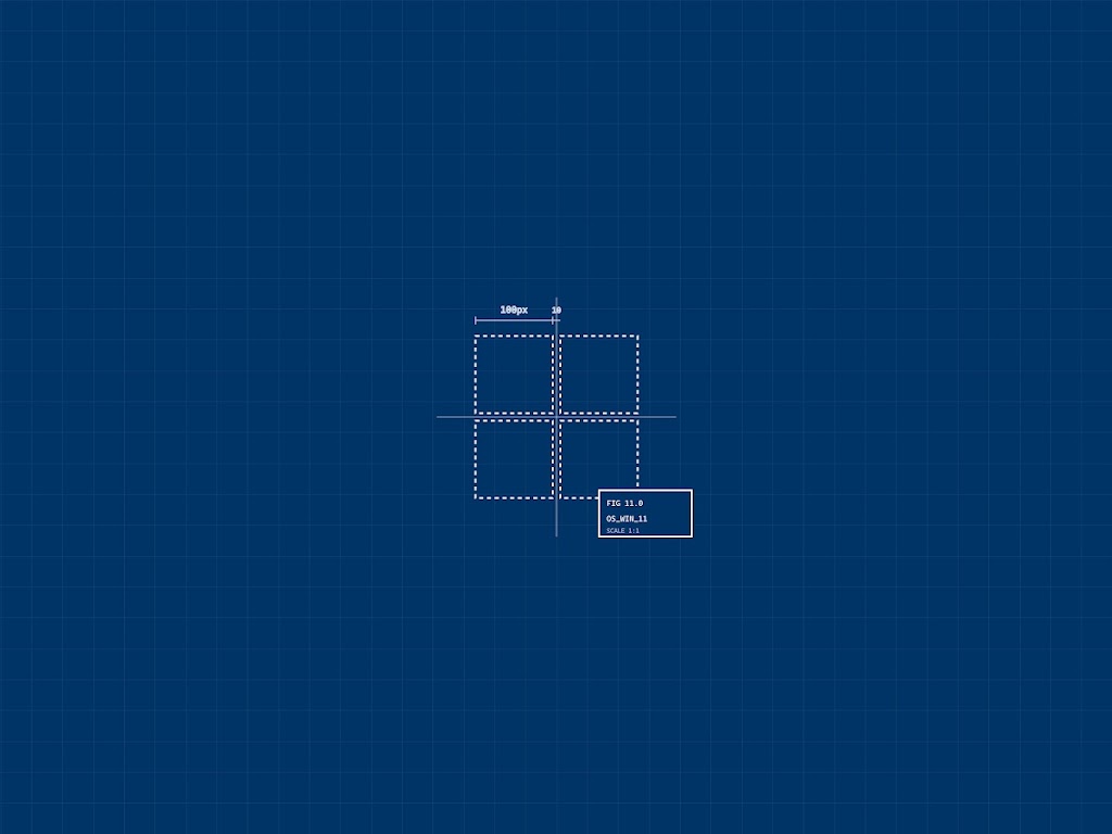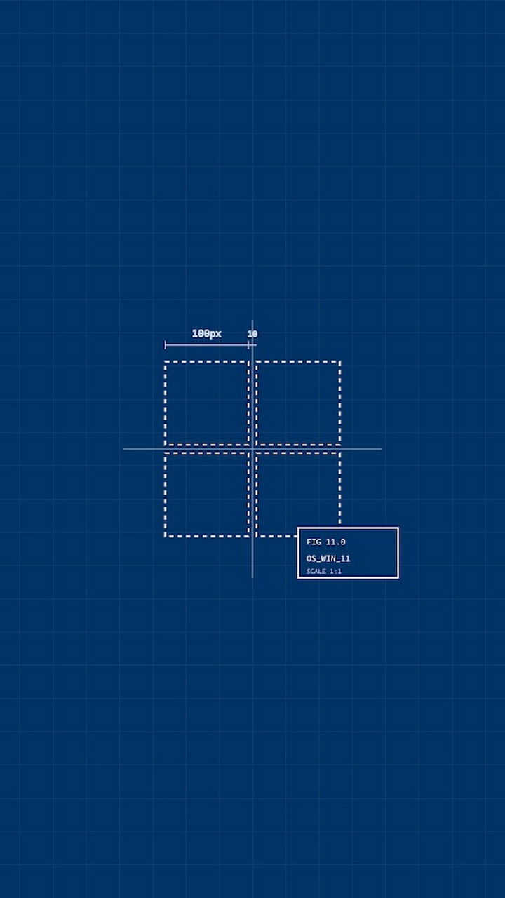 The Windows 11 logo blueprint structure is detailed with dimensions and scale on a deep blue technical background.