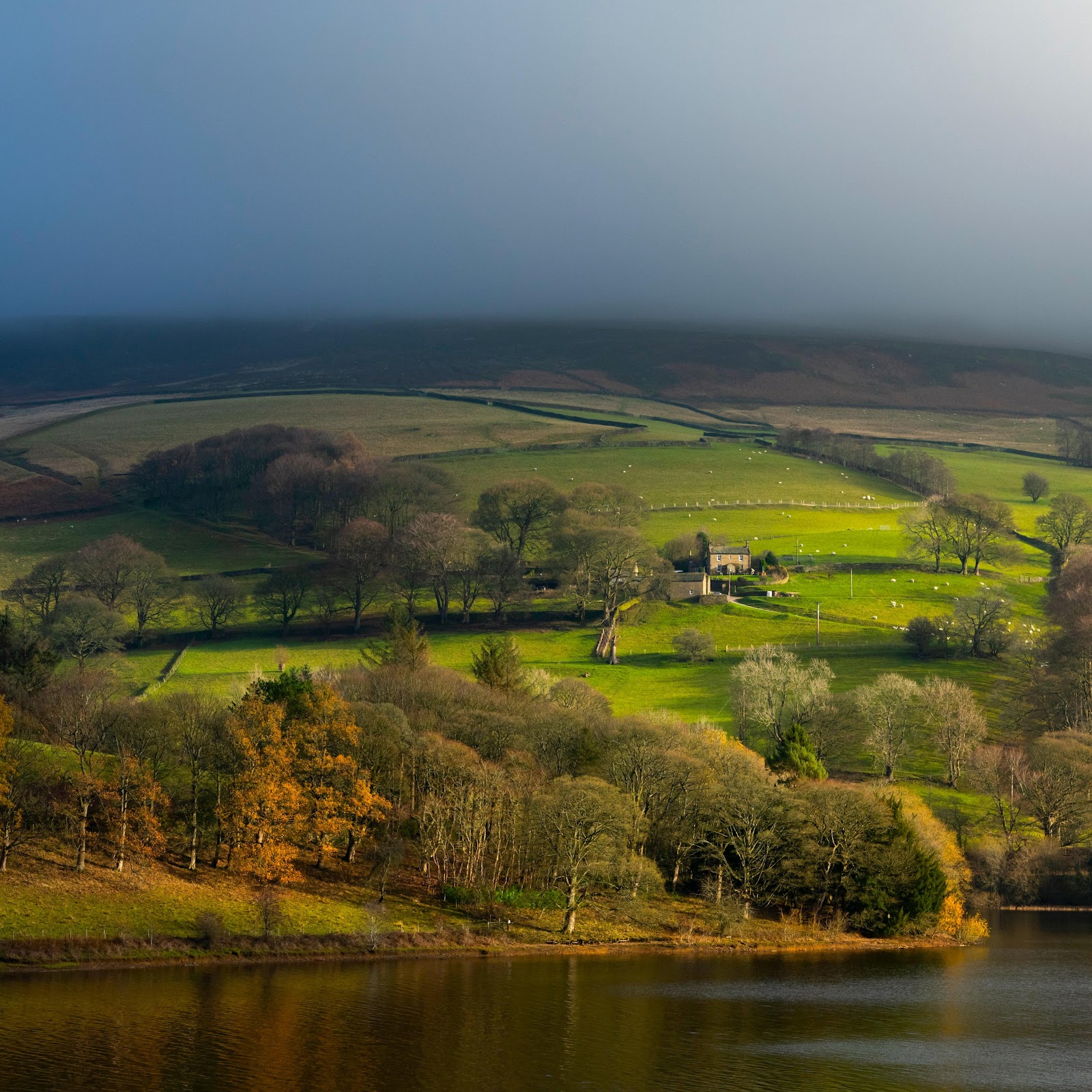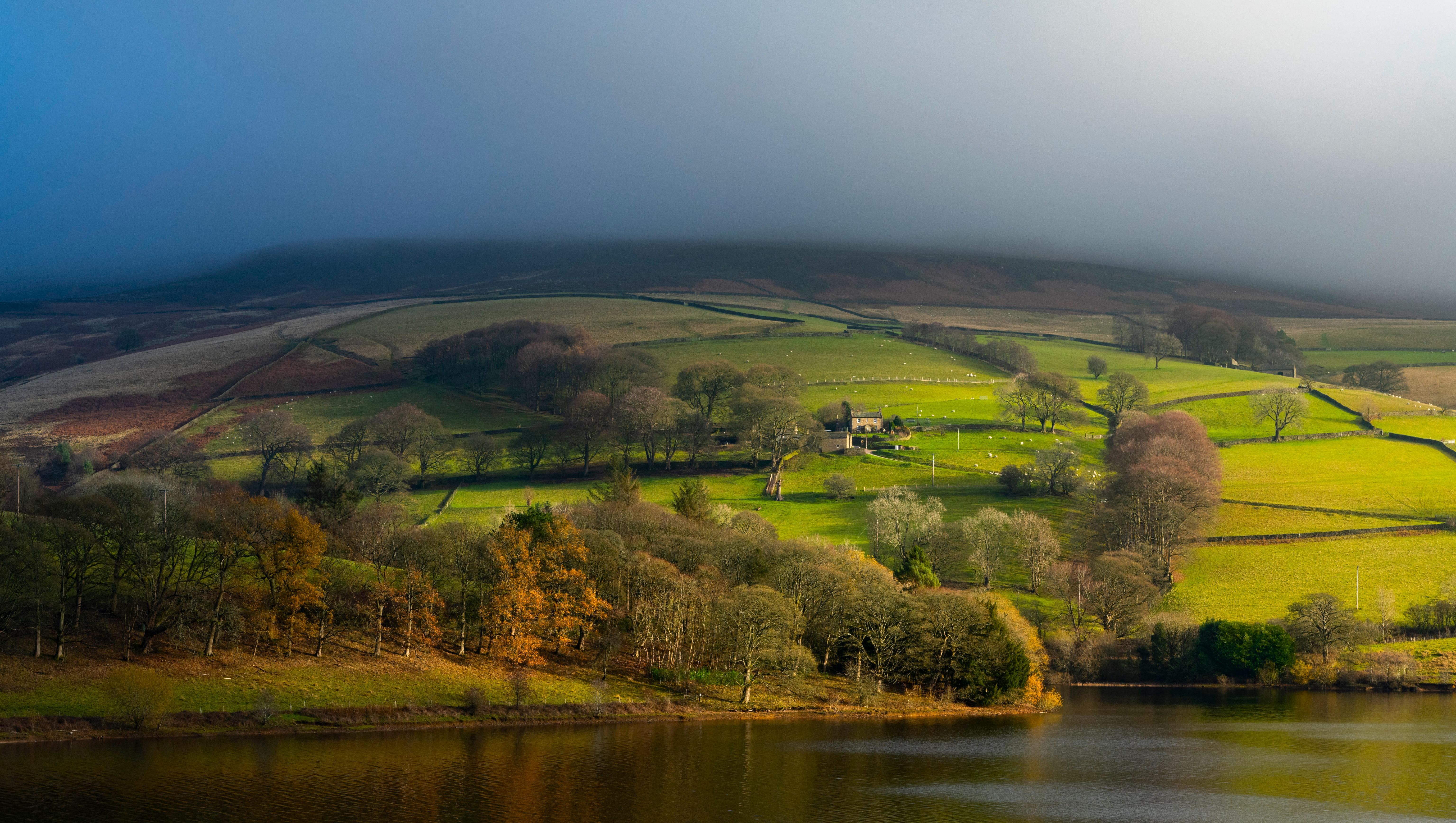 A vibrant green valley landscape slopes down toward a dark reservoir with dramatic lighting contrasting fog and sun.