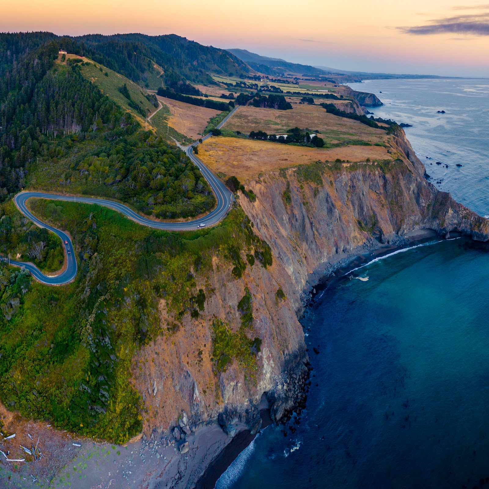 A winding road cuts through lush green forests and steep brown cliffs next to the deep blue Pacific ocean.