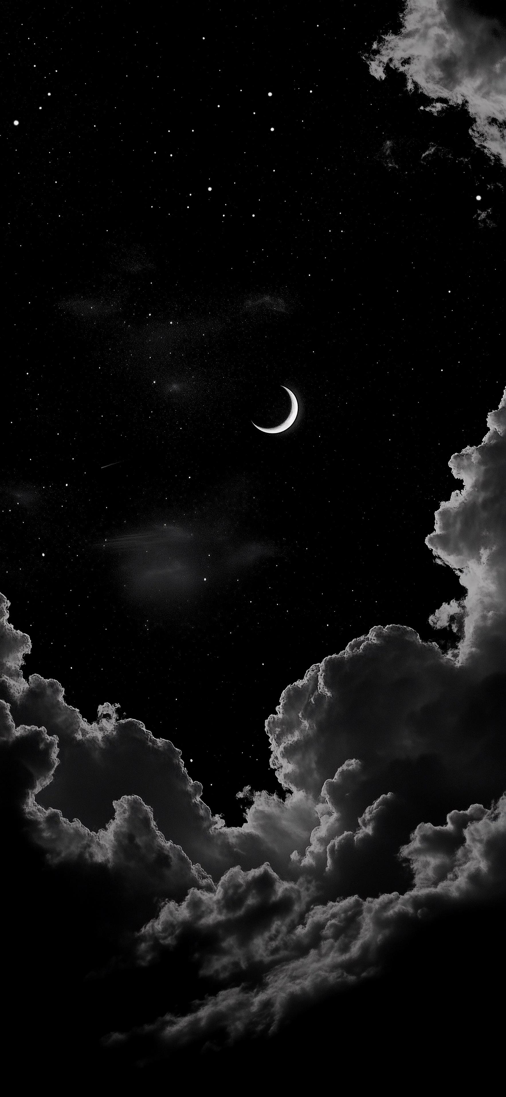 Crescent Moon And Night Clouds 2K iPhone Wallpaper A bright crescent moon shines in a dark starry sky surrounded by thick dramatic clouds in this peaceful monochrome night scene. eu455 486.18 KB 1766x3827 Download original File Size: Dimensions: Resolution: 2K Format: Mobile ID: Astronomy Black Black And White Clouds Moon Night Sky Stars