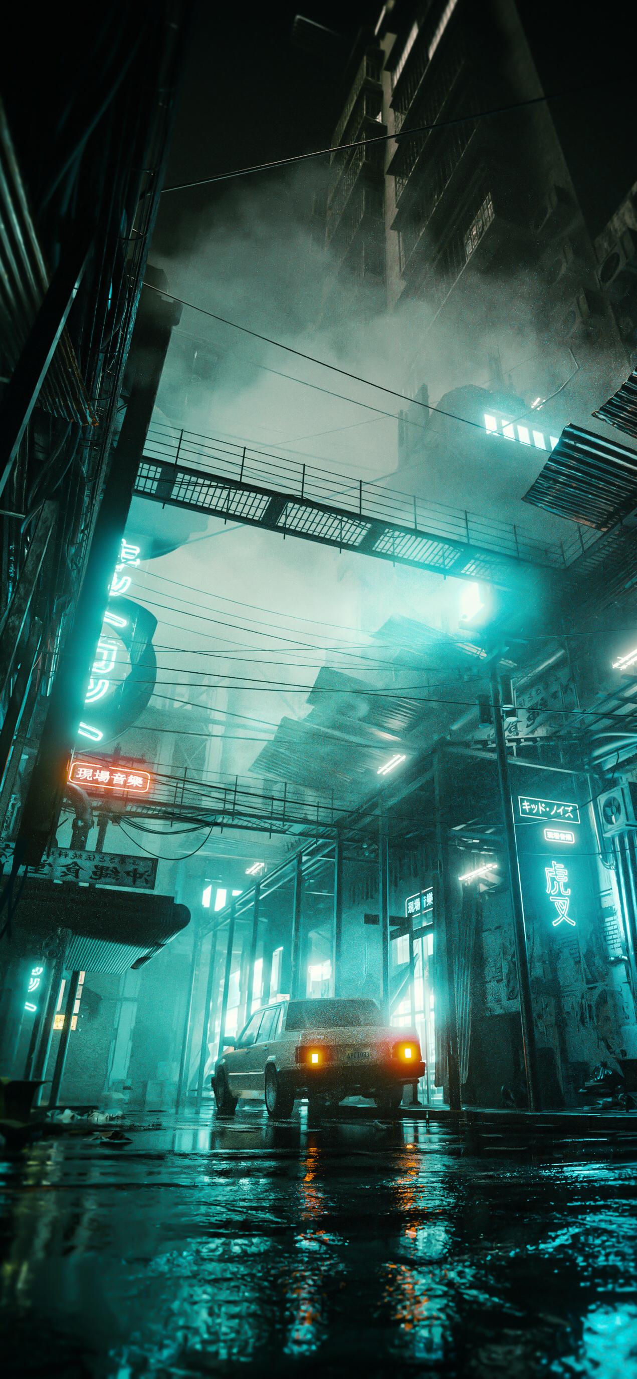 Cyberpunk City Alley With Car Full HD iPhone Wallpaper A vintage car sits in a dark cyberpunk alley surrounded by glowing teal neon signs and thick white steam under industrial metal bridges. en627 472.97 KB 1271x2753 Download original File Size: Dimensions: Resolution: Full HD Format: Mobile ID: Blue Cinematic Cityscape Cyberpunk Futuristic Neon Night