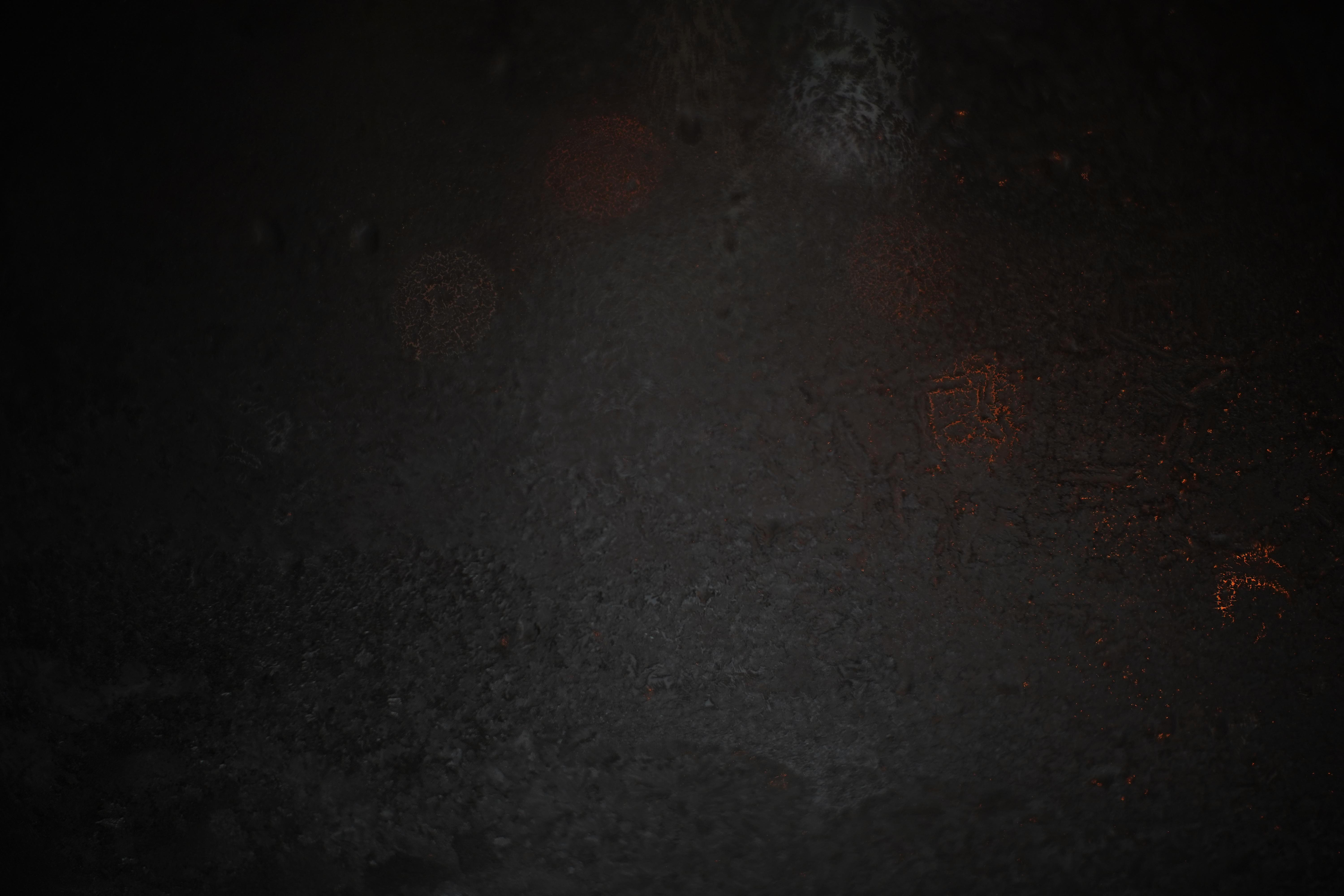 A dark gritty surface displays faint orange sparks and soft bokeh lights creating a mysterious and moody atmosphere under dim lighting with a rough texture.