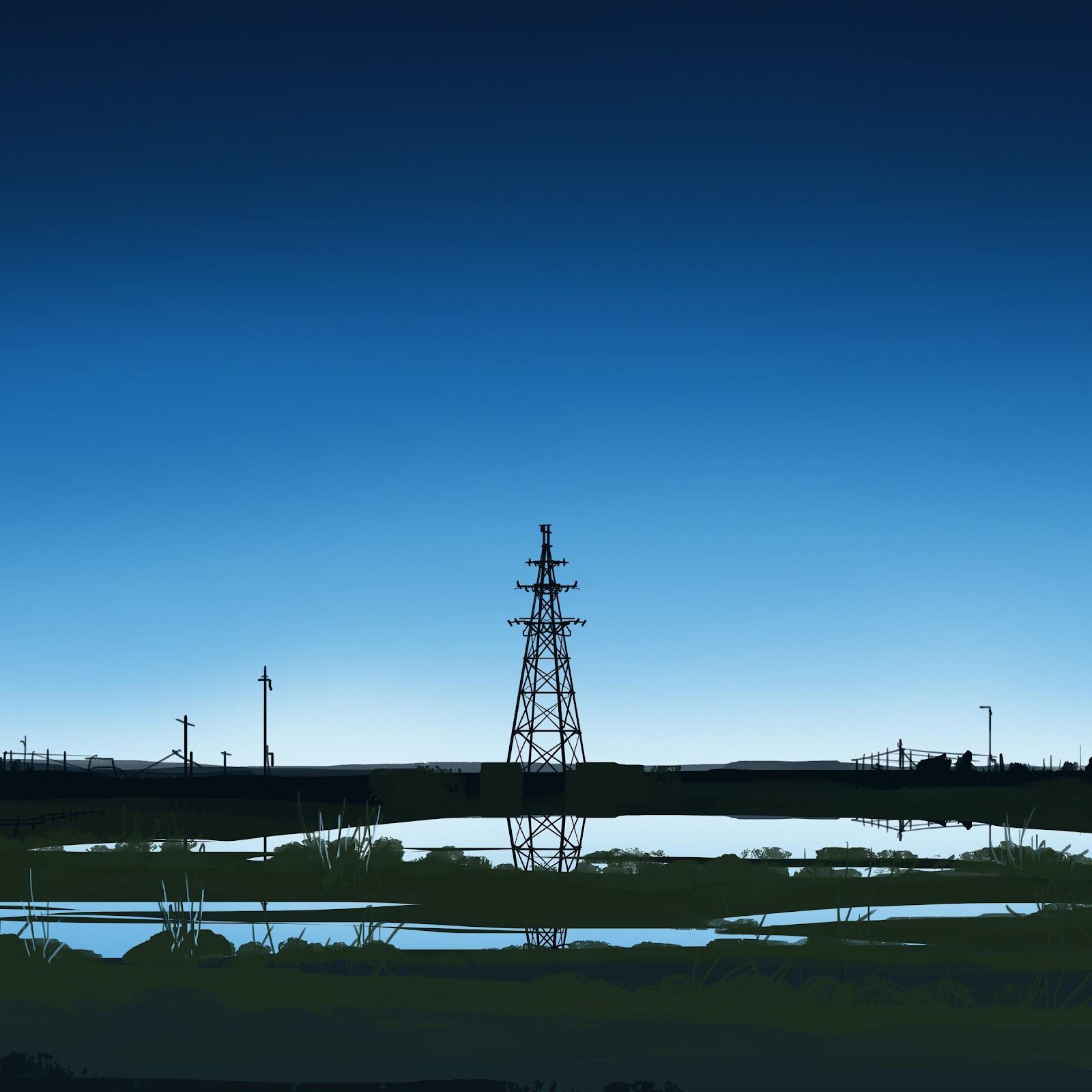 A single electrical pylon stands in a dark, marshy field with reflections of the deep blue sky.