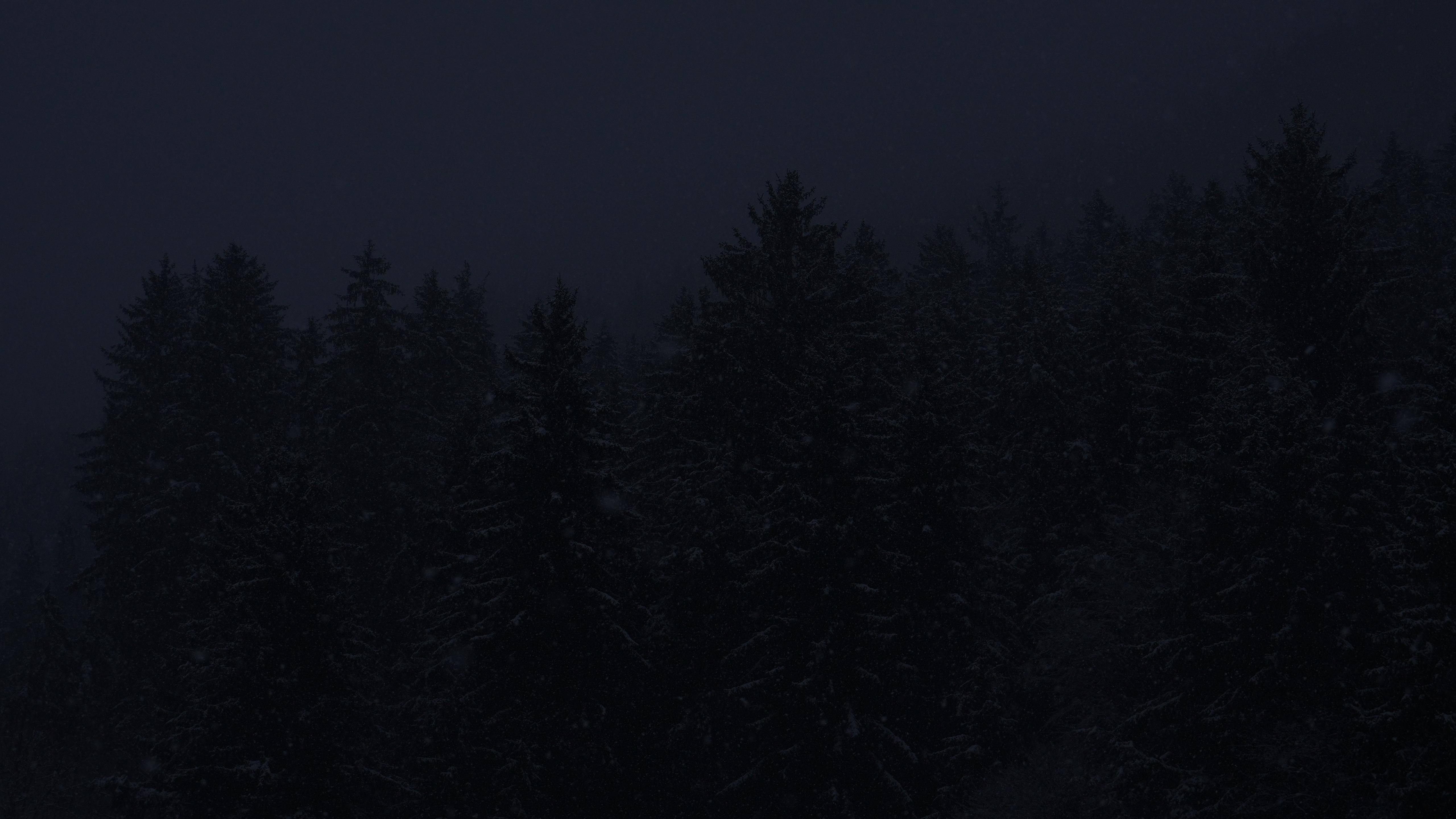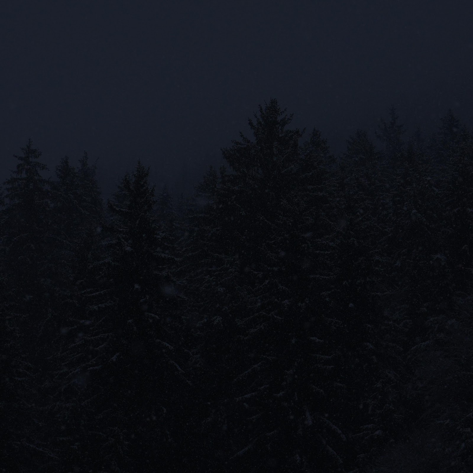 A dense line of dark pine trees stands under a deep night sky with a moody and mysterious atmosphere in this cold winter landscape.