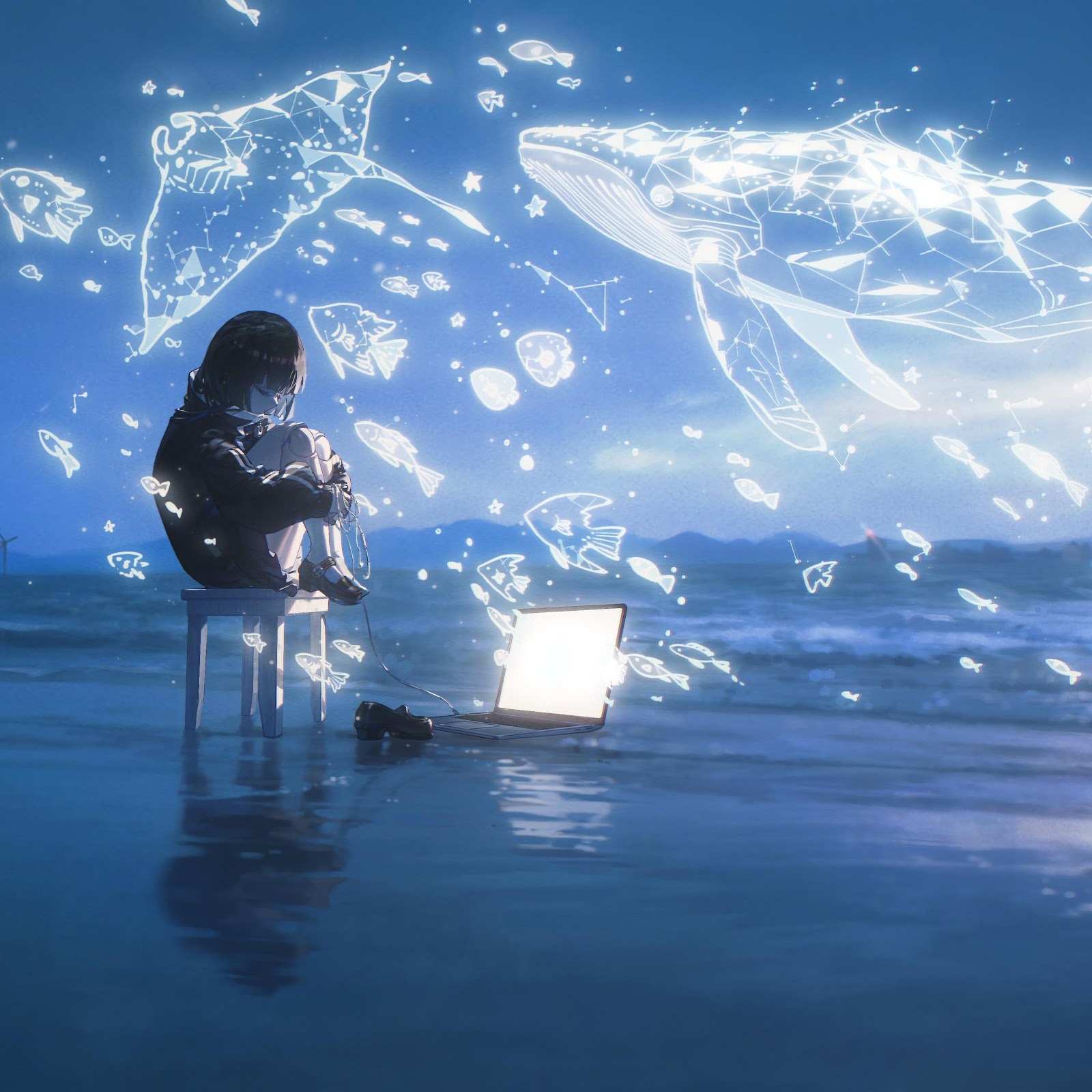 A lone person sits by the ocean shore next to a glowing laptop, watching large digital whales and small fish float in the deep blue night sky.