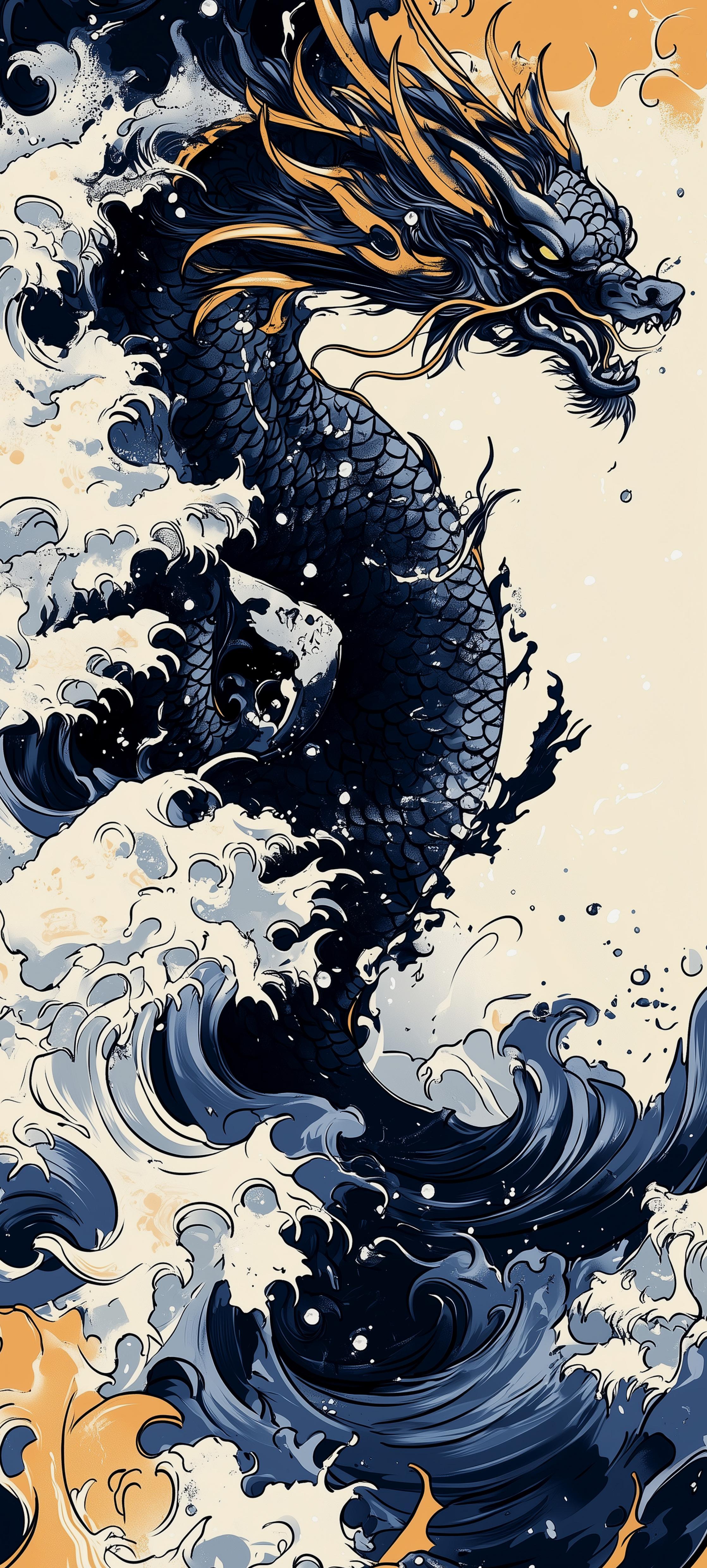 Dragon Rising From Ocean Waves 4K iPhone Wallpaper A majestic dark blue dragon rises from crashing ocean waves with golden horns in a traditional Japanese art style with high contrast. vr859 1.38 MB 2236x4957 Download original File Size: Dimensions: Resolution: 4K Format: Mobile ID: Blue Dragon Fantasy Japanese Art Mythology Ocean Waves