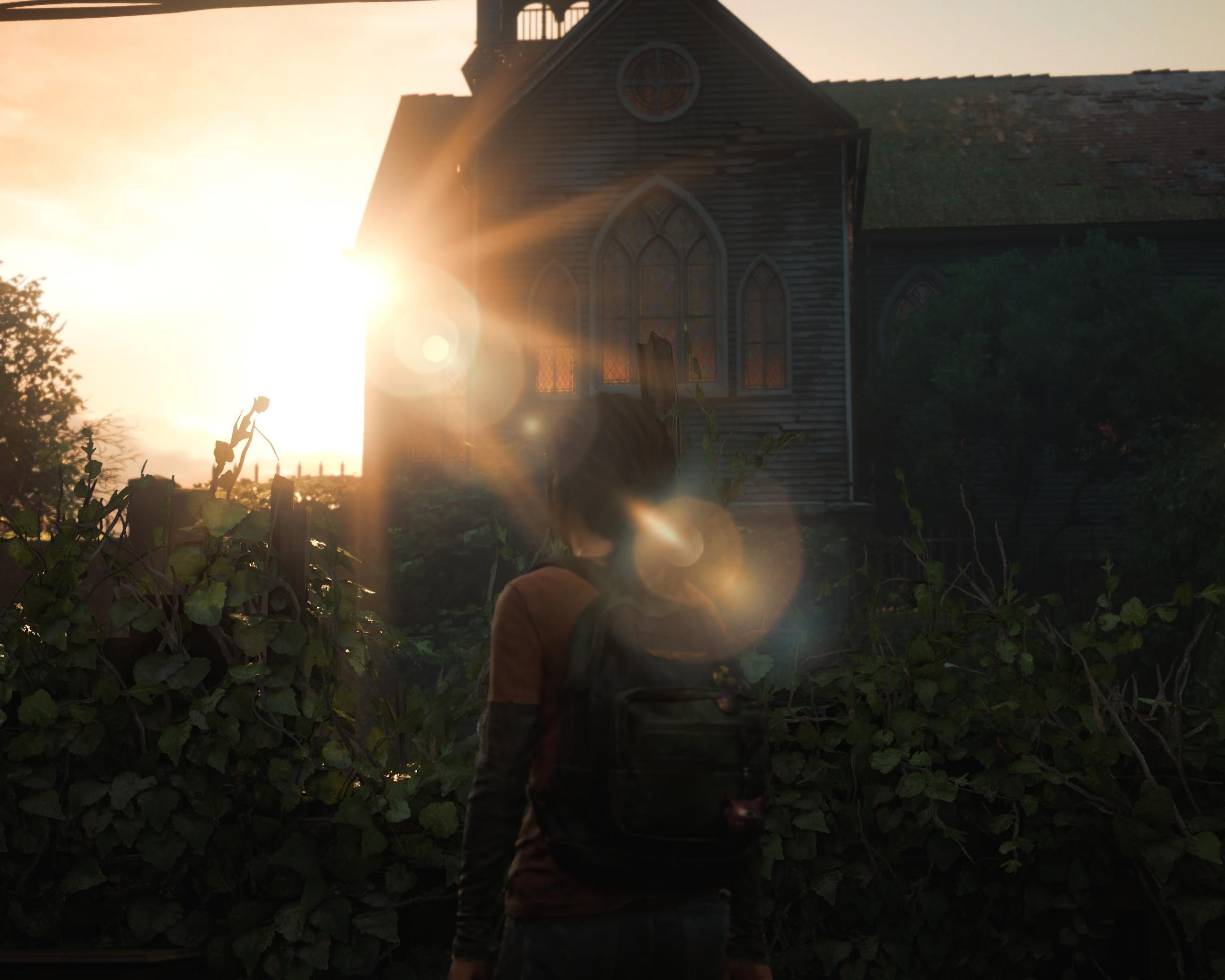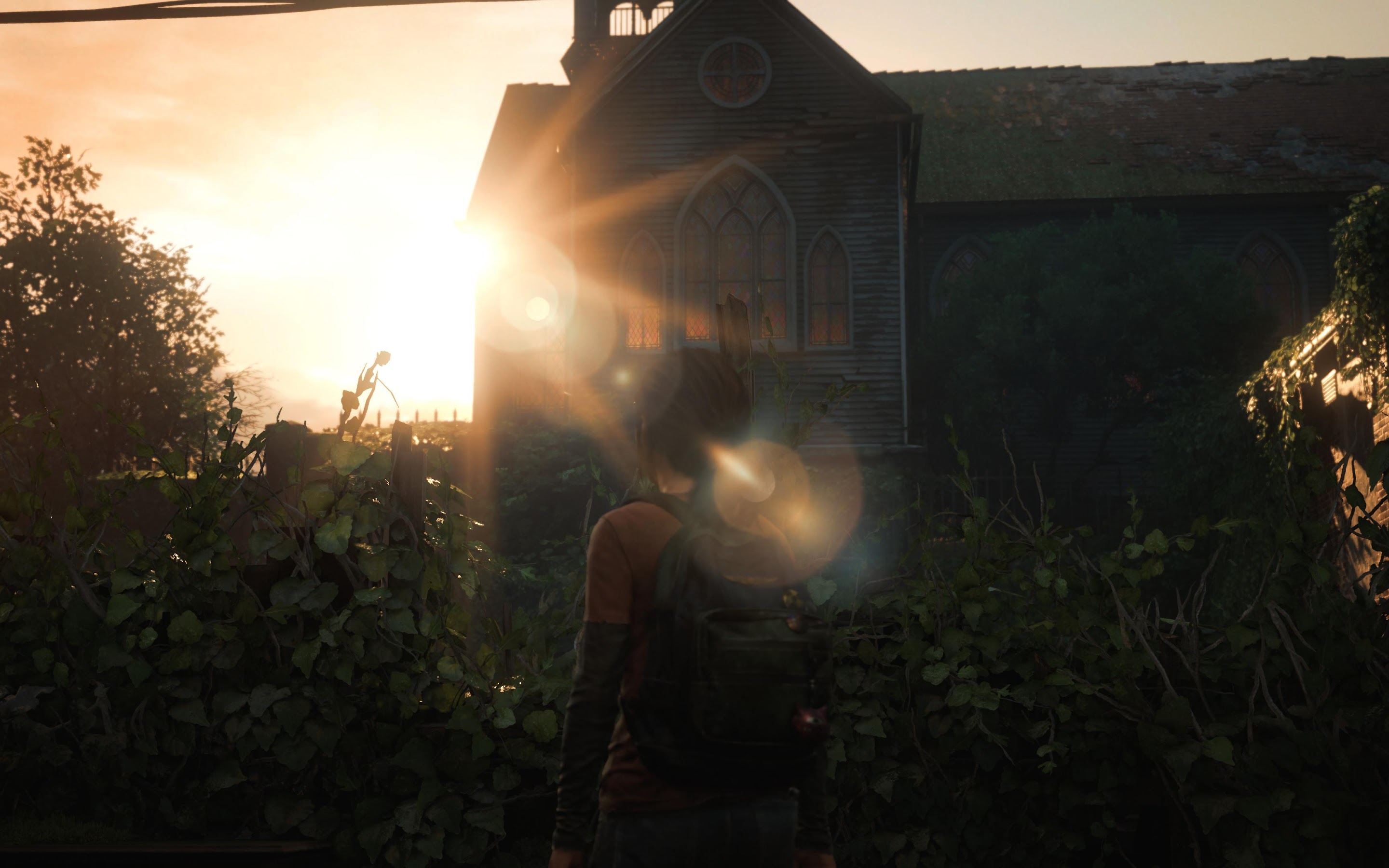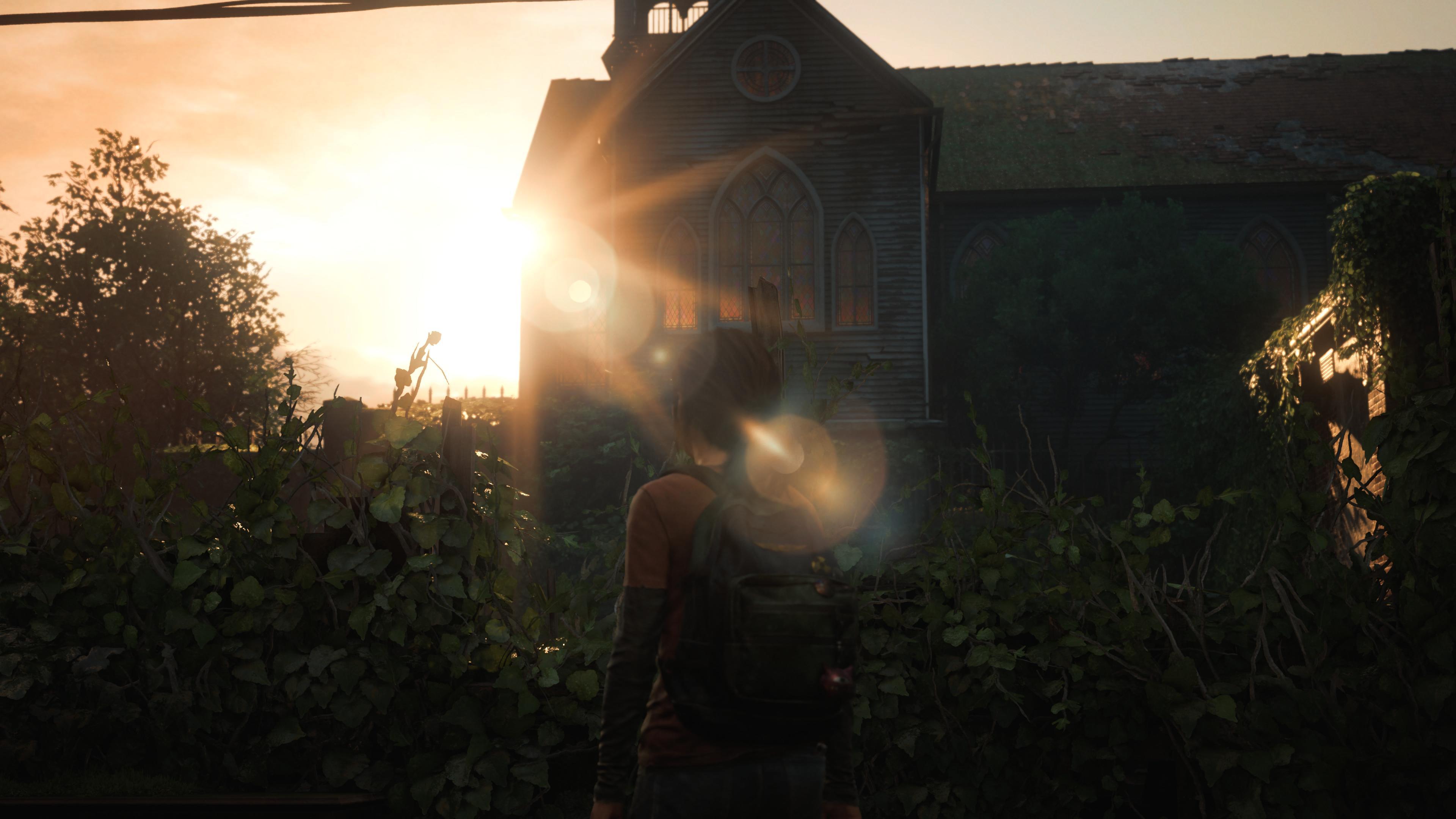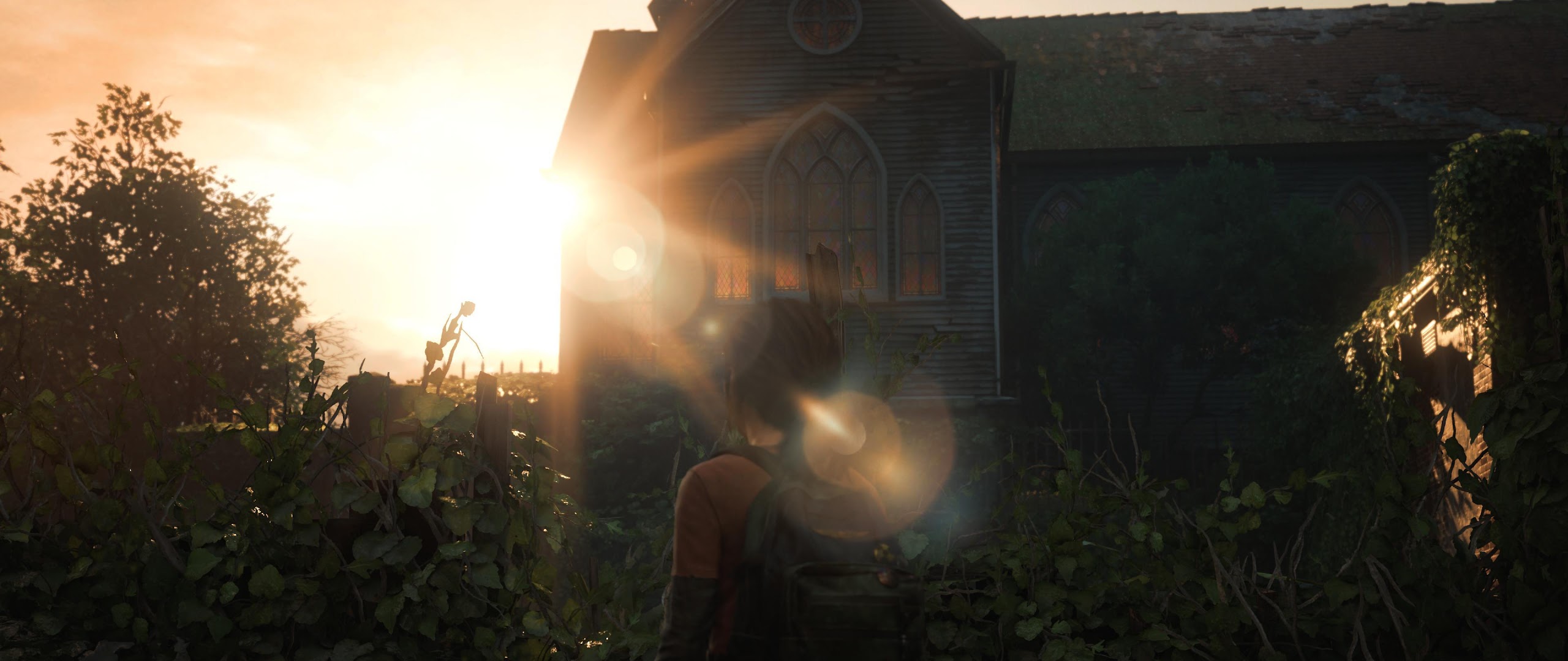 Ellie from The Last of Us stands in front of an overgrown wooden church with golden sunlight and a large lens flare.