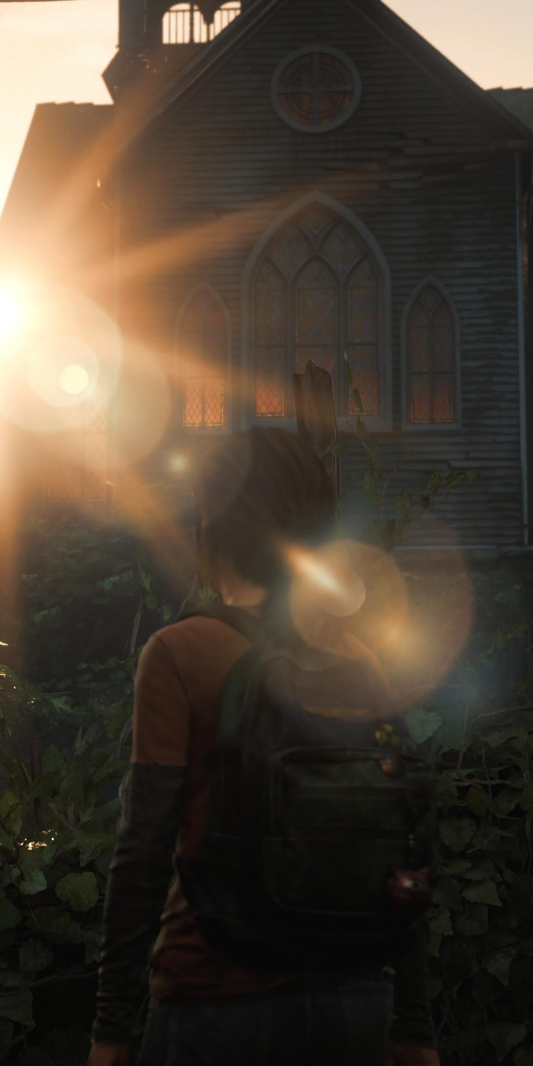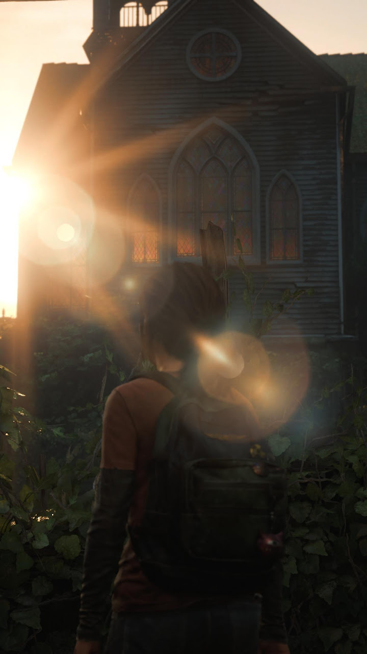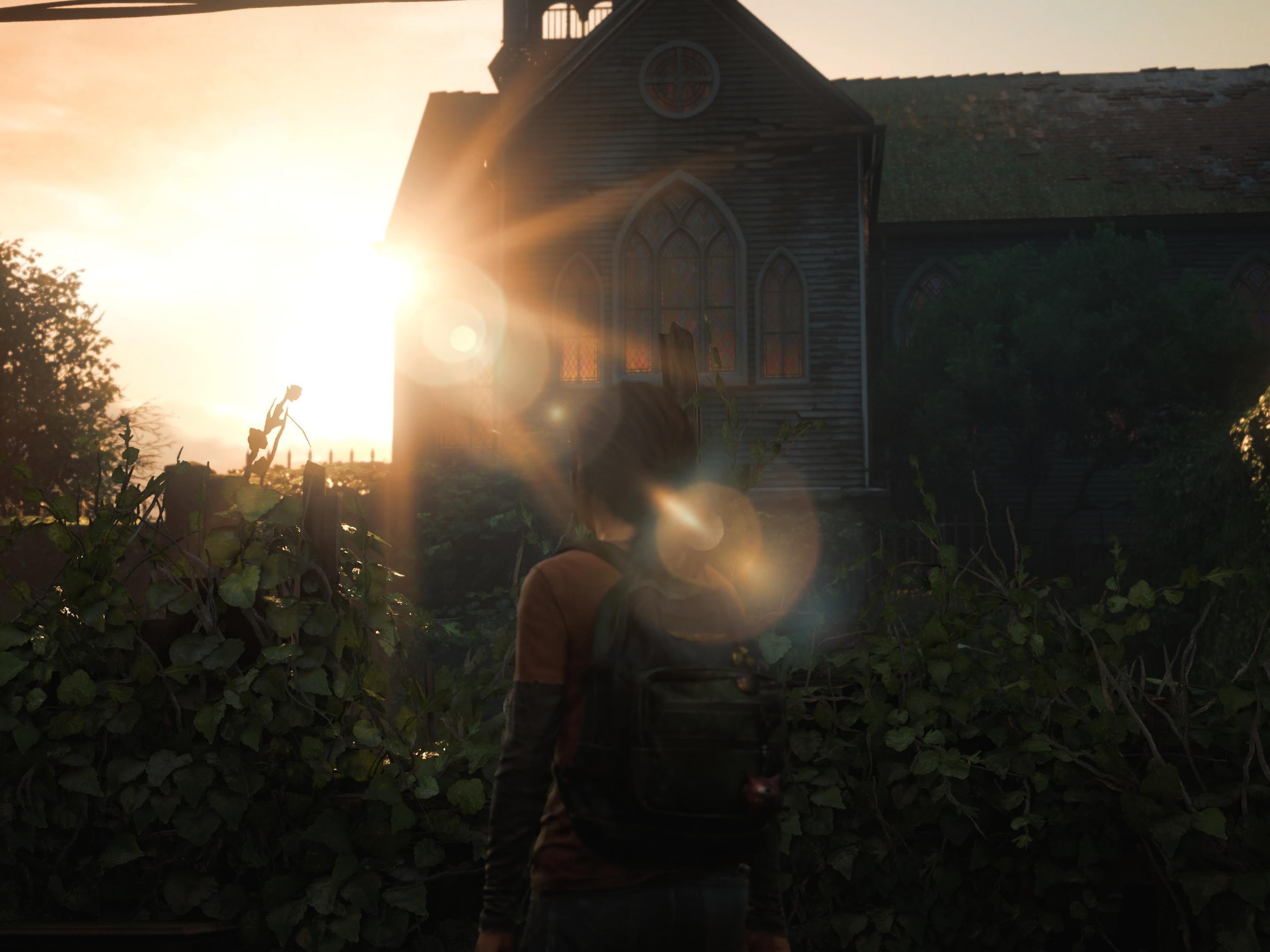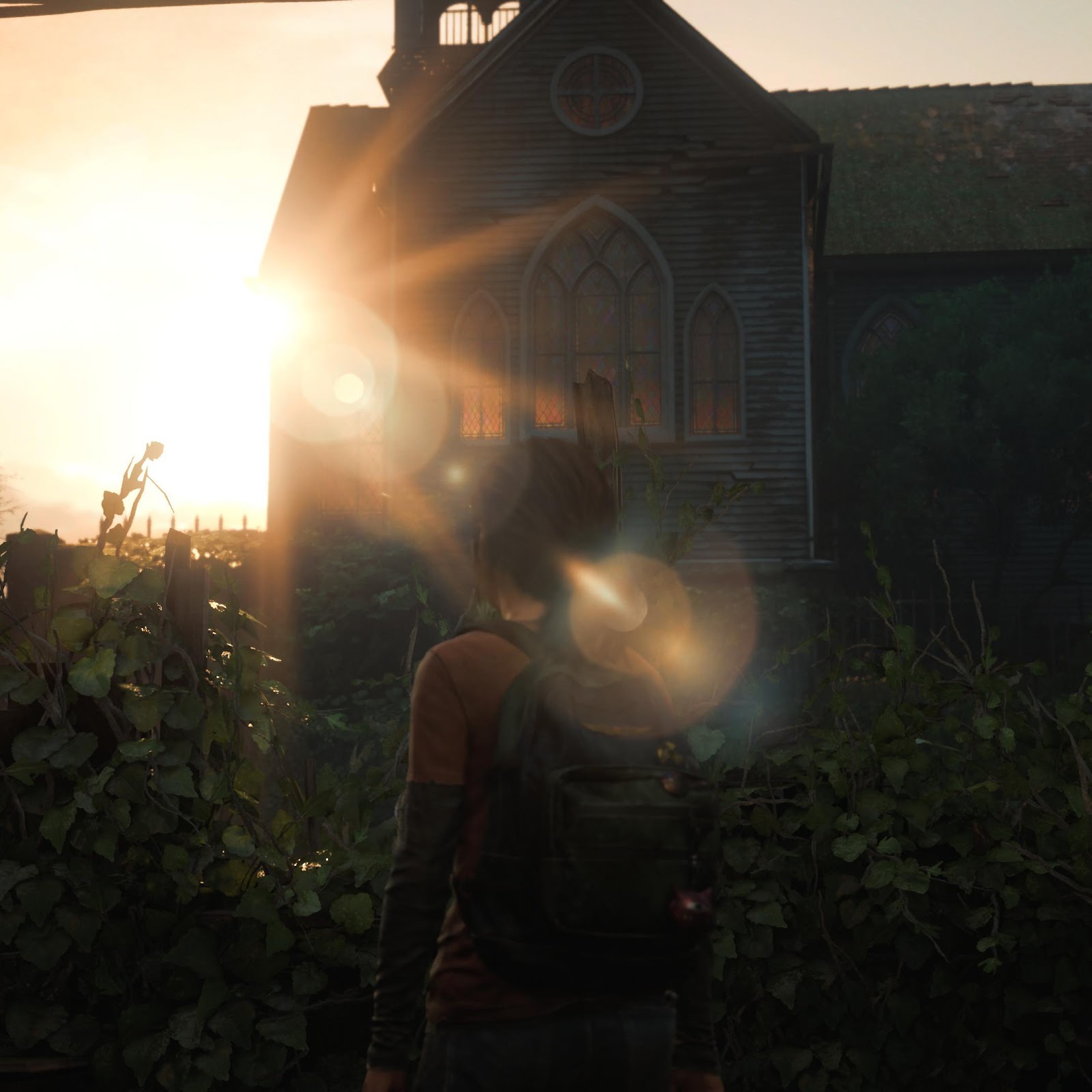 Ellie from The Last of Us stands in front of an overgrown wooden church with golden sunlight and a large lens flare.