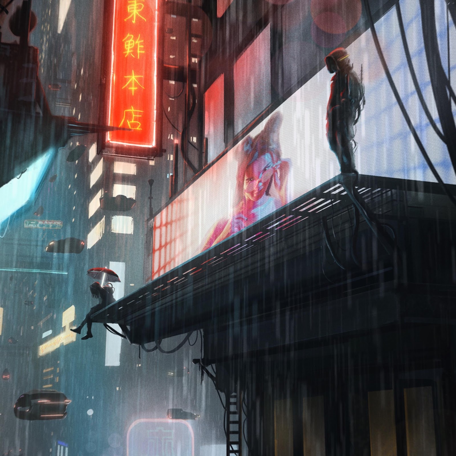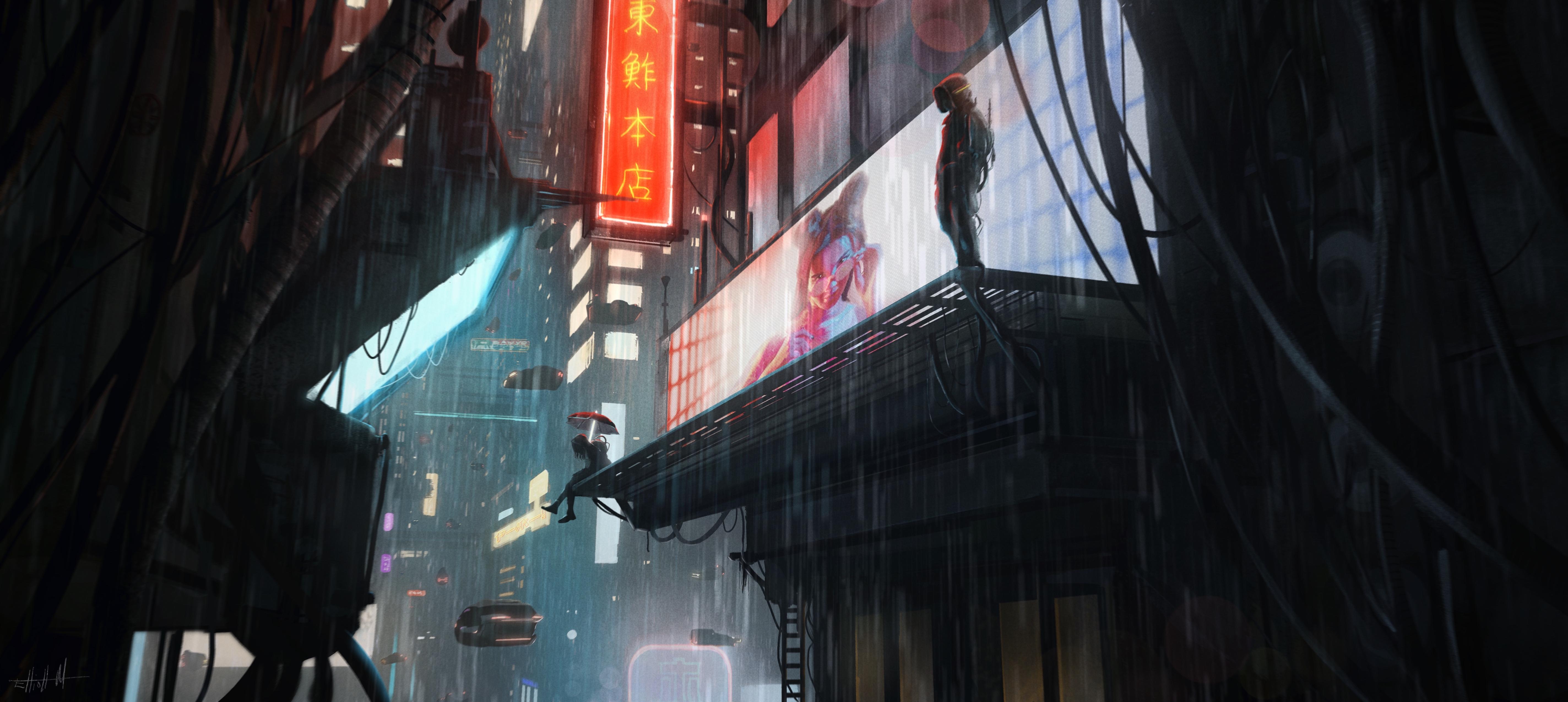 A hooded traveler stands on a tall building ledge overlooking a rainy cyberpunk city with glowing neon lights and flying cars in the air.