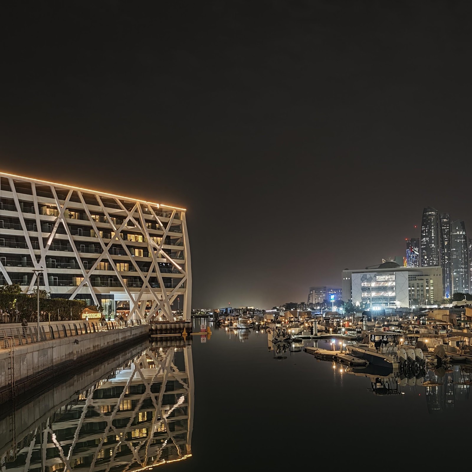 A large white geometric waterfront building stands over a calm marina with city lights reflecting in the water at night.